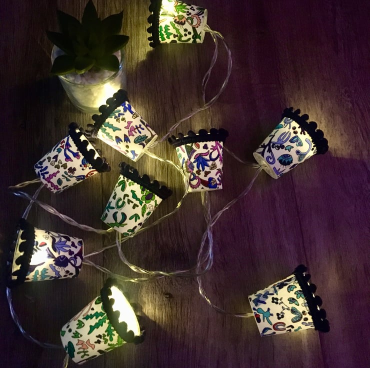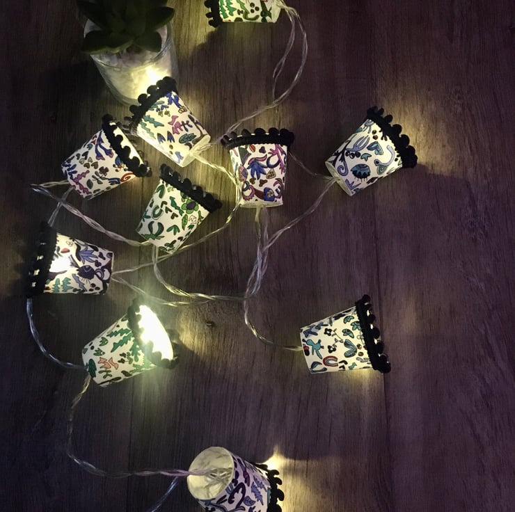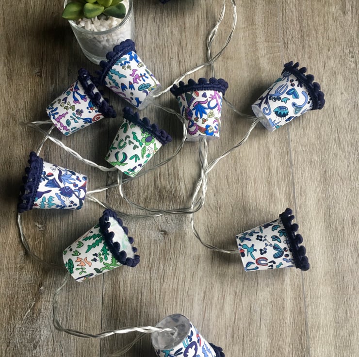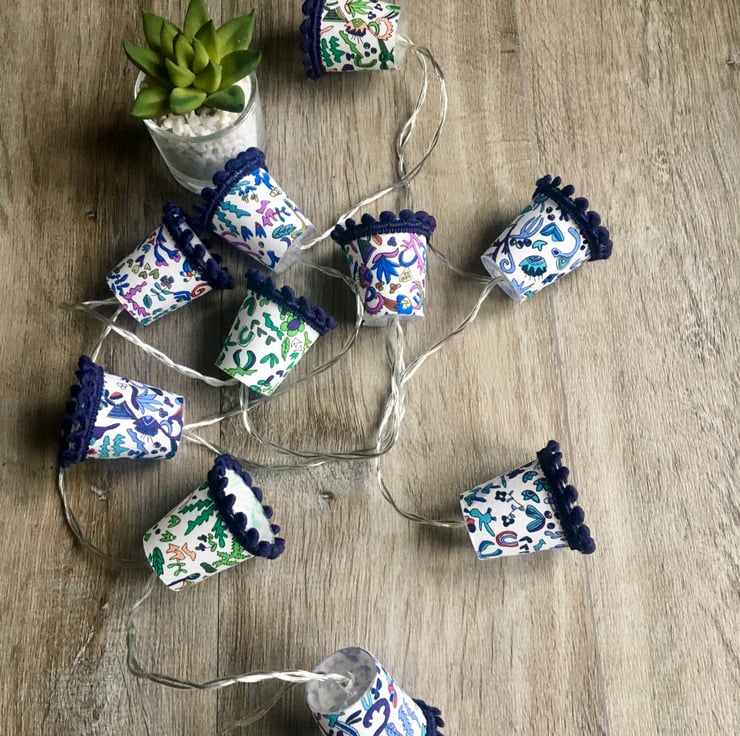These mini lampshades are perfect to drape along a mantlepiece or shelf, around the head of a bed, or strung across a mirror or picture frame.