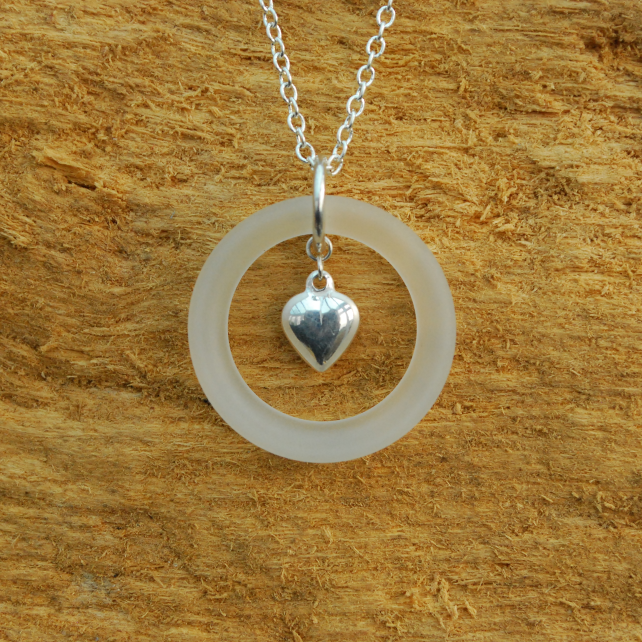 We love to make pendants which are simple but beautiful, and this is a perfect example. The glass ring has come from the end of a broken bottle neck we found on the beach, and tumbled until it is rounded, smooth and finely frosted. In the ring is a pretty sterling silver puff heart. This is an elegant pendant which looks great against any colour background. All the metal used in the pendant is sterling silver.