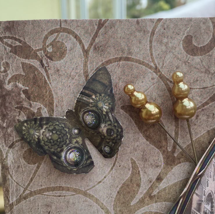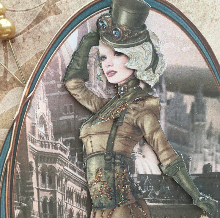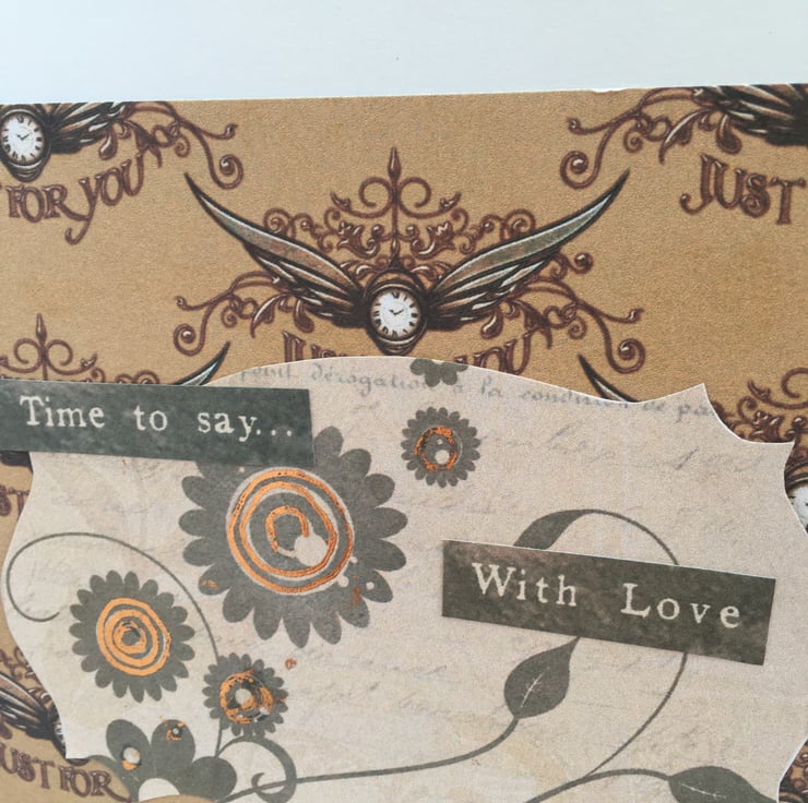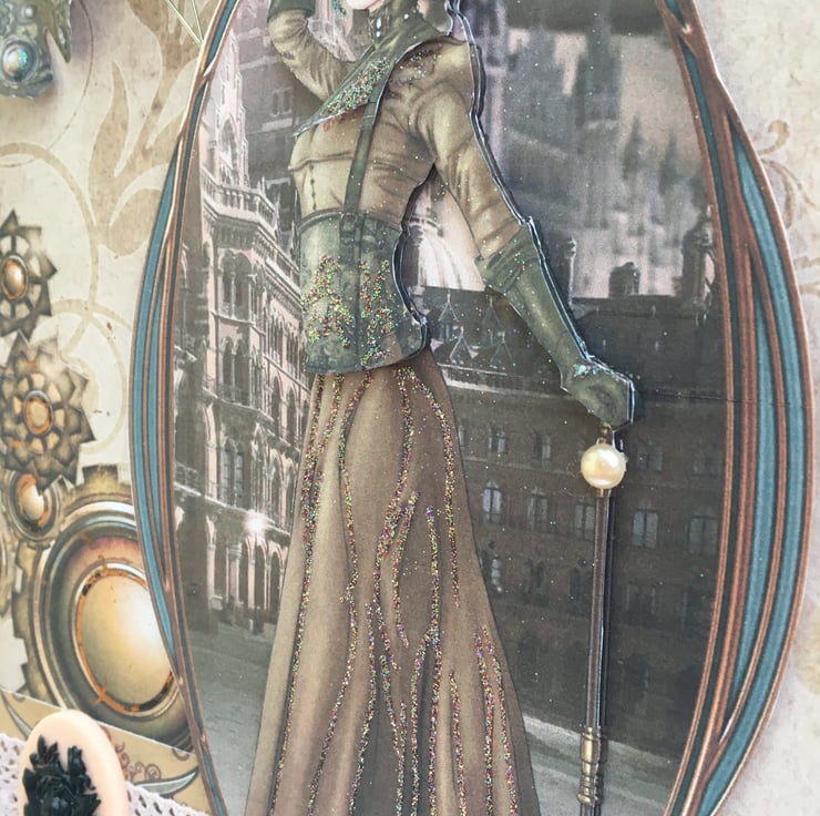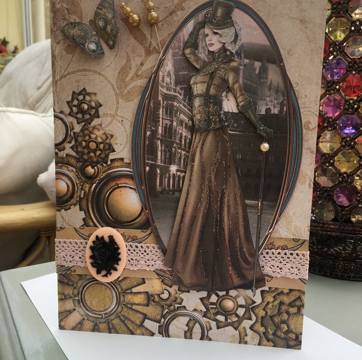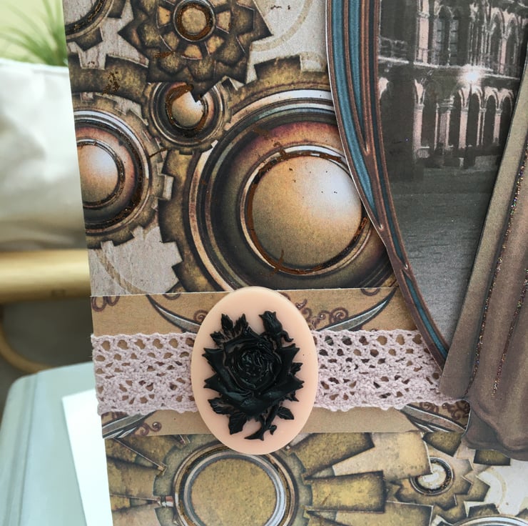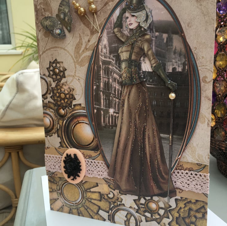 How to make cogs feminine? Well I think this card achieves just that. A tall and elegant lady in steampunk style, a long skirt with a corset top. She is topped off with long gloves and a top hat, complete with goggles and cane. This decoupage image is typically steampunk victoriana. She stands in front of a gothic street scene. The card has styalised cogs for good measure. A band of matching paper has an antique rose crocheted ribbon running across it. This is complimented with a pink/peach cameo plaque with a black floral decal. The design is finished with a steampunk butterfly and 2 bronze topped hat pins. The coulour scheme is definitely on the sepia side but has touches of pink, blue, copper and glitter accents. Inside the card is a matching insert with the greetings of Time to say and With love. It is 25.5x18cm so is a big card. It can be used for many occations such as birthday, anniversary, valentines - anything you want.
