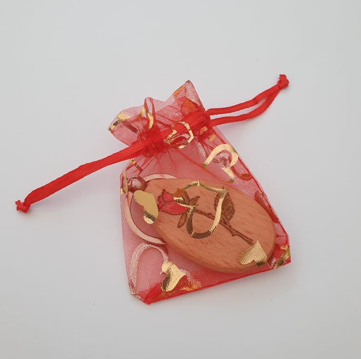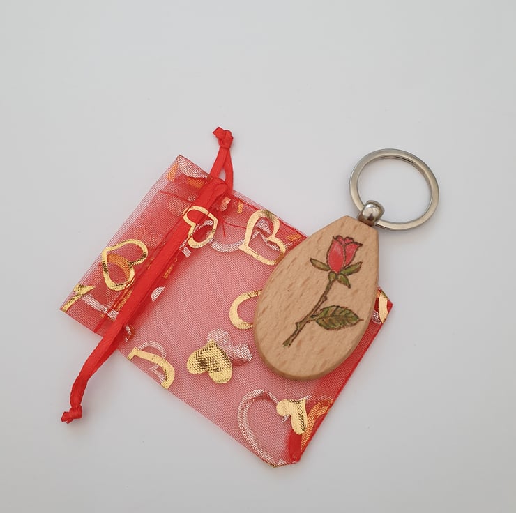 Lovely double-sided solid wood keyring which has been carefully handburnt, using the art of pyrography, with a single red rose on one side and the word love on the other. The rose has been coloured with watercolour paints.