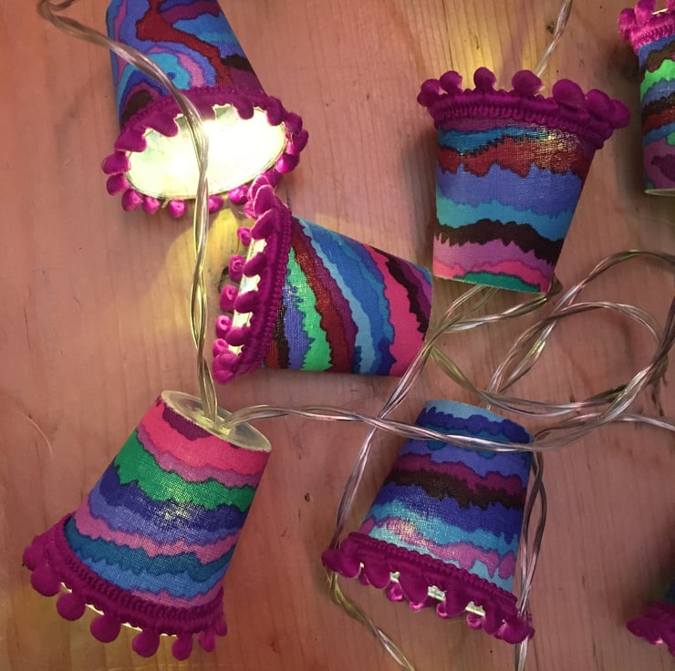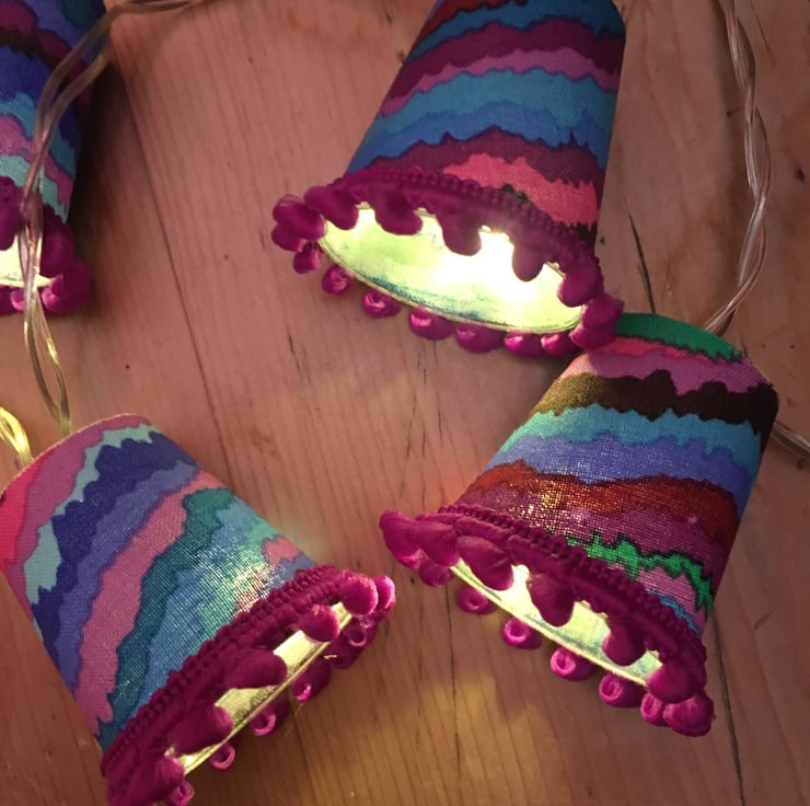 These mini lampshades are perfect to drape along a mantlepiece or shelf, around the head of a bed, or strung across a mirror or picture frame.