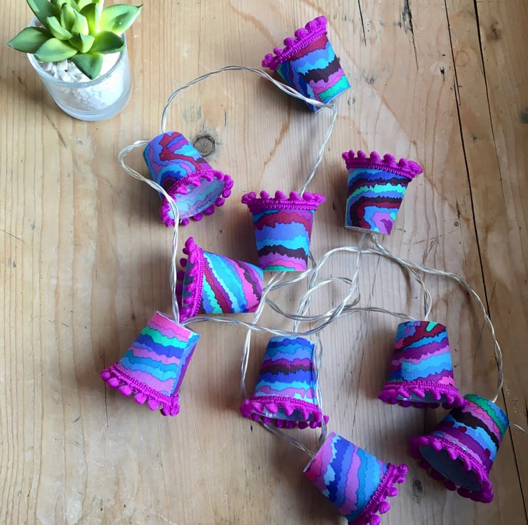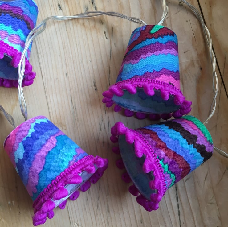 Kaffe Fassett is renowned for his bold and vibrant use of colour - and the dreamy waves of pinks, blues and purple in this string of mini lampshades showcases his skills perfectly. And that magenta mini Pom Pom trim....oh my, oh my! A bright statement of colour for any decor.