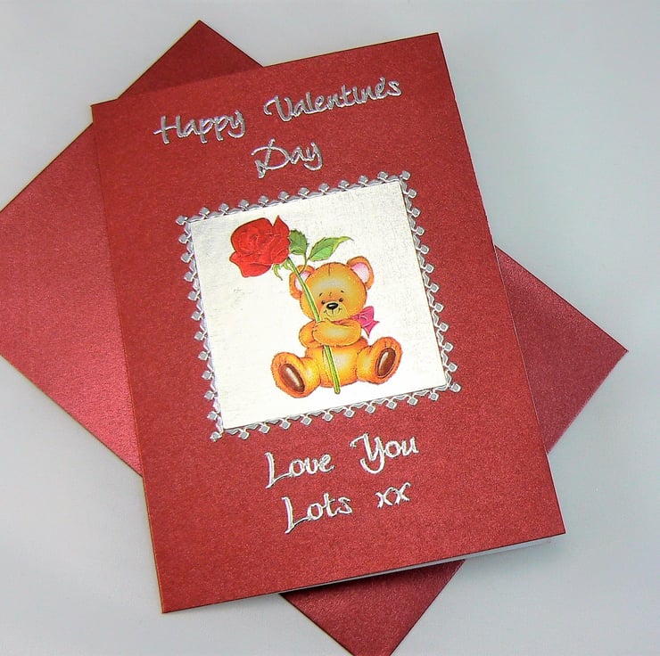 Valentine's card with the words 'Happy Valentine's day Love you lots xx' on the front along with a Dufex foil picture of a little teddy bear with a red bow and holding a single red rose. The card has matching red metallic envelope