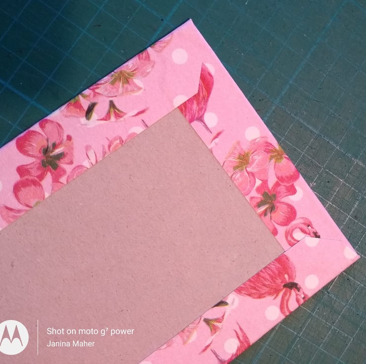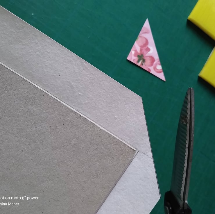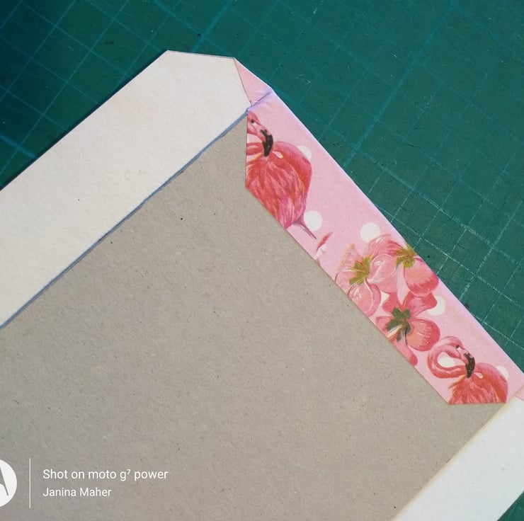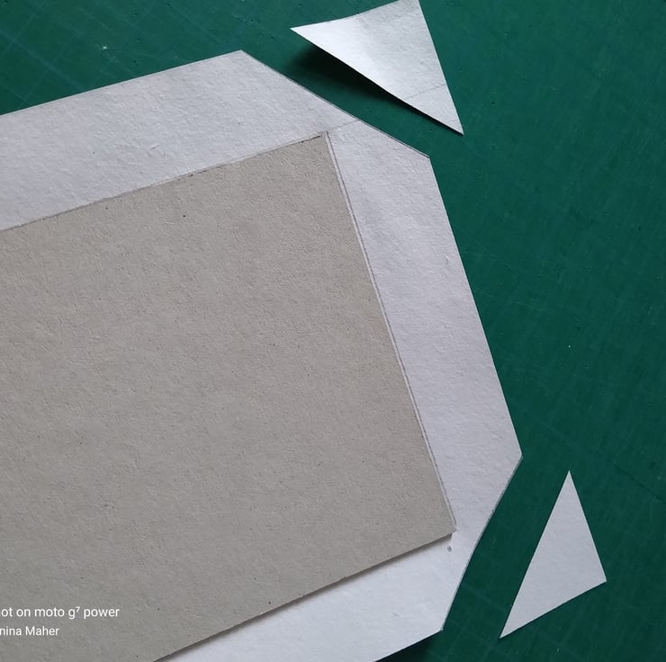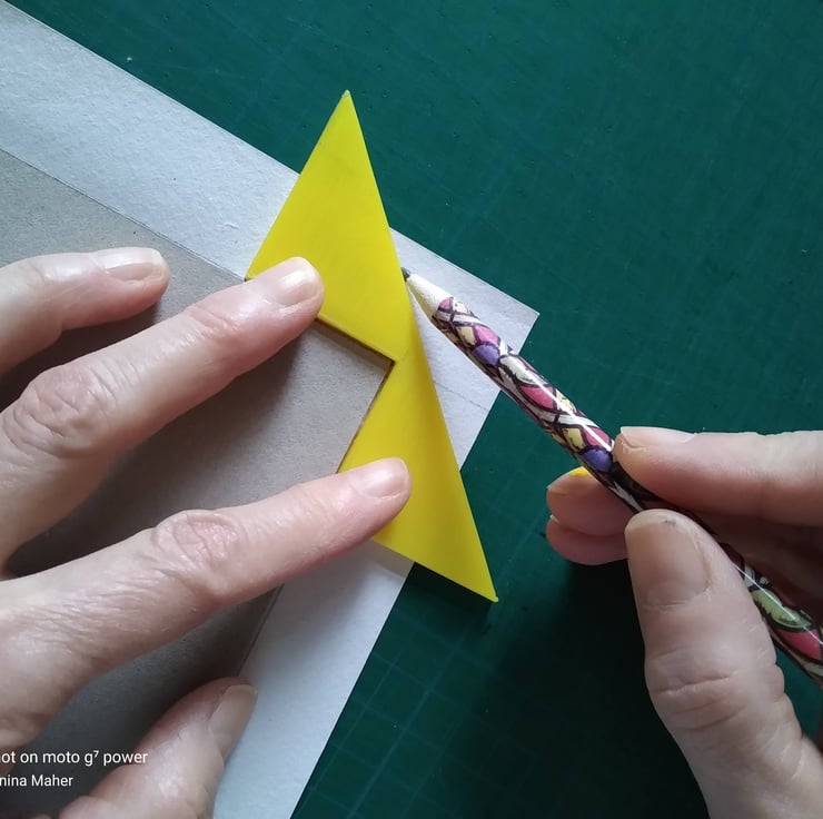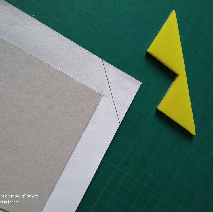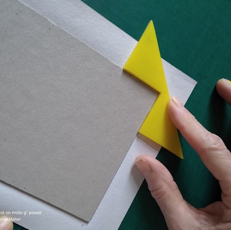 This handy little tool helps you get perfect 45 degree angles when you are mitring a corner in bookbinding. It has been designed to give you a gap of exactly 0.7cm between the corner of the greyboard, and the cut line. This is the right distance to make sure the greyboard doesn’t poke through the corner, and allows for a nice neat flat corner on your book without too much bulk