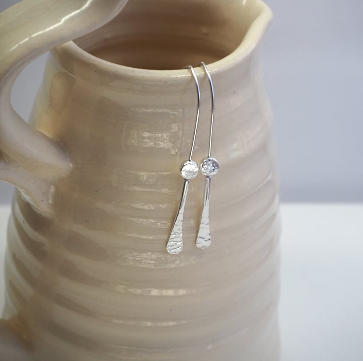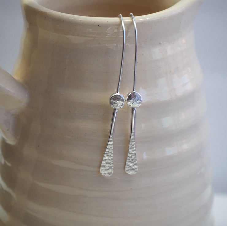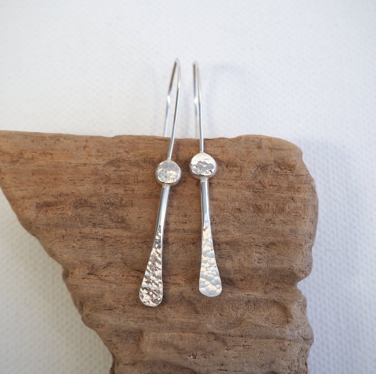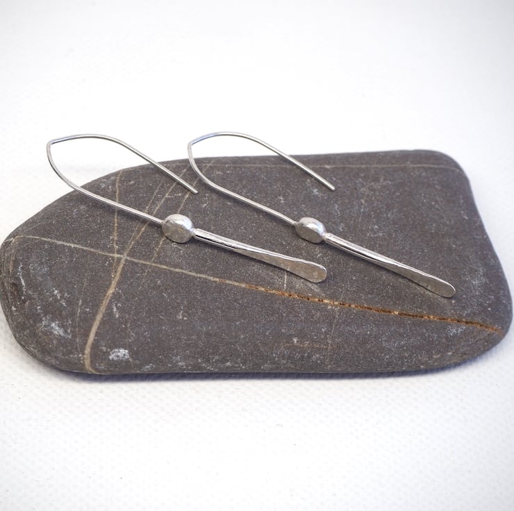 These minimalist dangly earrings are completely handmade from Argentium silver (hypoallergenic). They feature a forged rod that has been fused to a silver pebble . The silver has been lightly hammered to add a lovely dimpled texture and they have been polished to a bright shine to finish.
