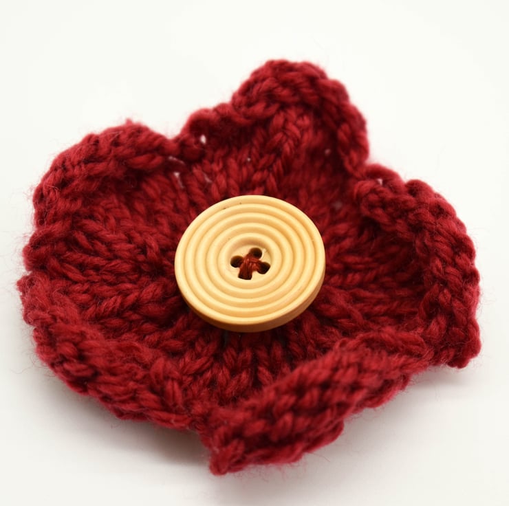 Knitted in a wine red merino wool, the five petal flower is hand sewn with light brown wooden button and the brooch bar pin safely secured at the back.