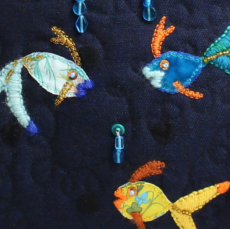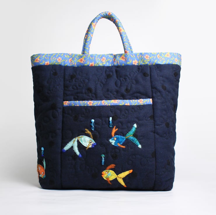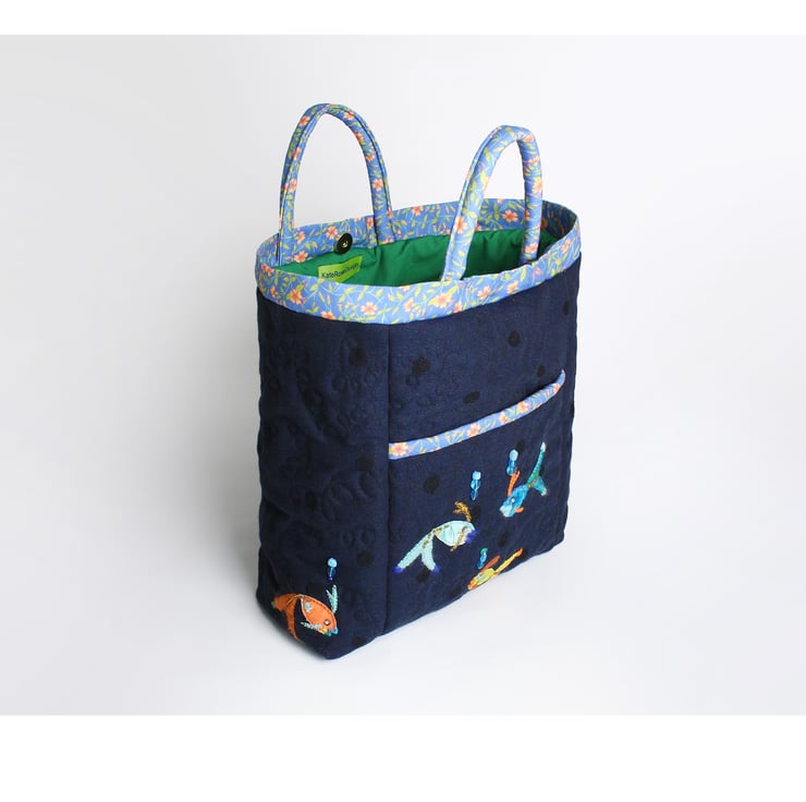 The bag has been made using navy blue linen style fabric with large interwoven navy spots, I have used wadding inside and quilted it with spiral stitching. it is a very soft bag. I have appliquéd and embroidered colourful fish , three onto the pocket and one at the side of the bag. The pocket is trimmed with my navy campion print cotton. The handles and trim are also made from this campion print and the lining is made from green poplin. The handles are wadded and piped for strength and comfort.