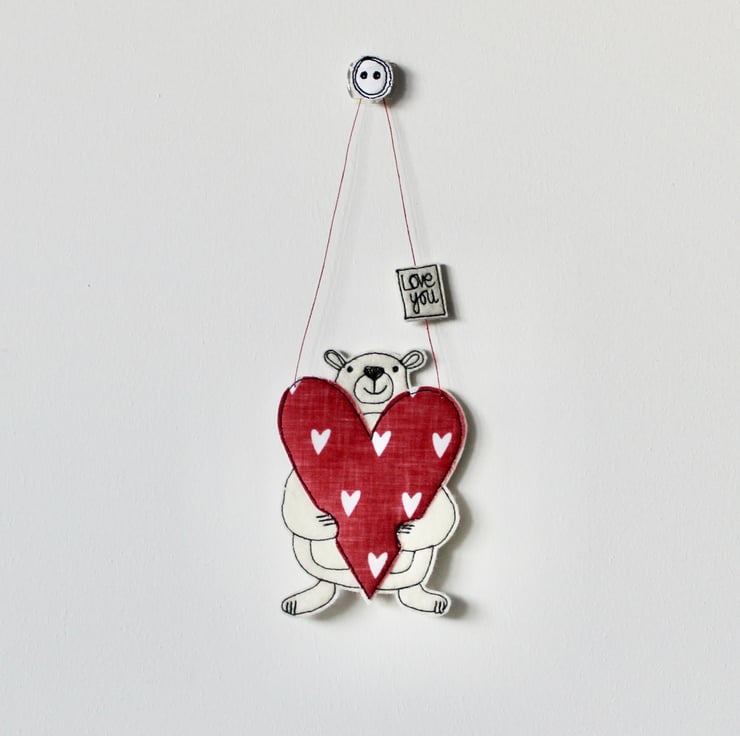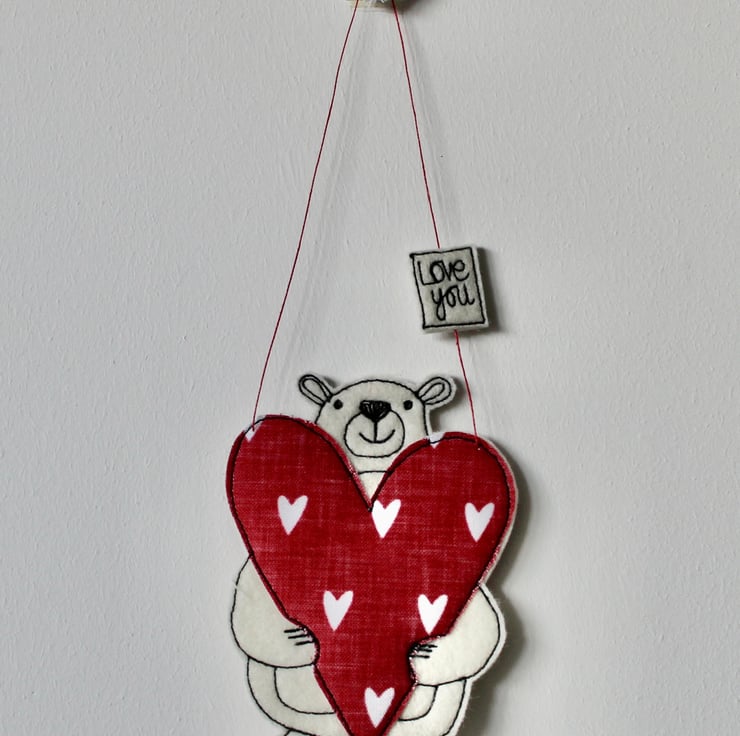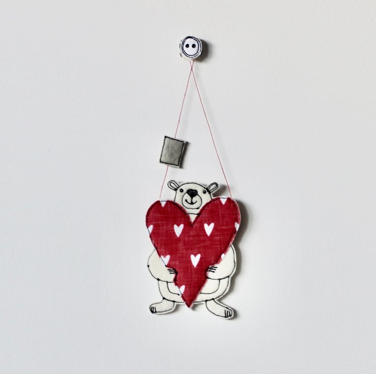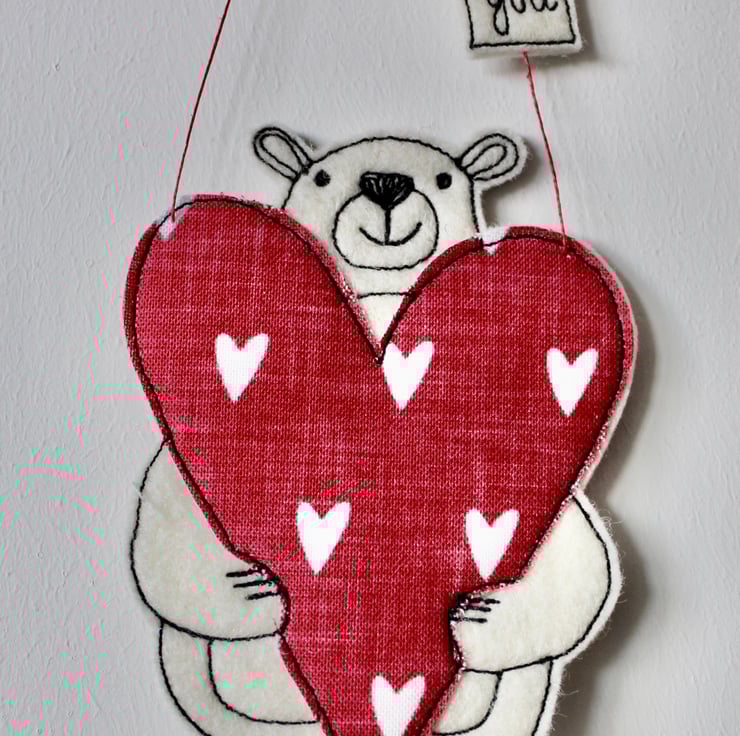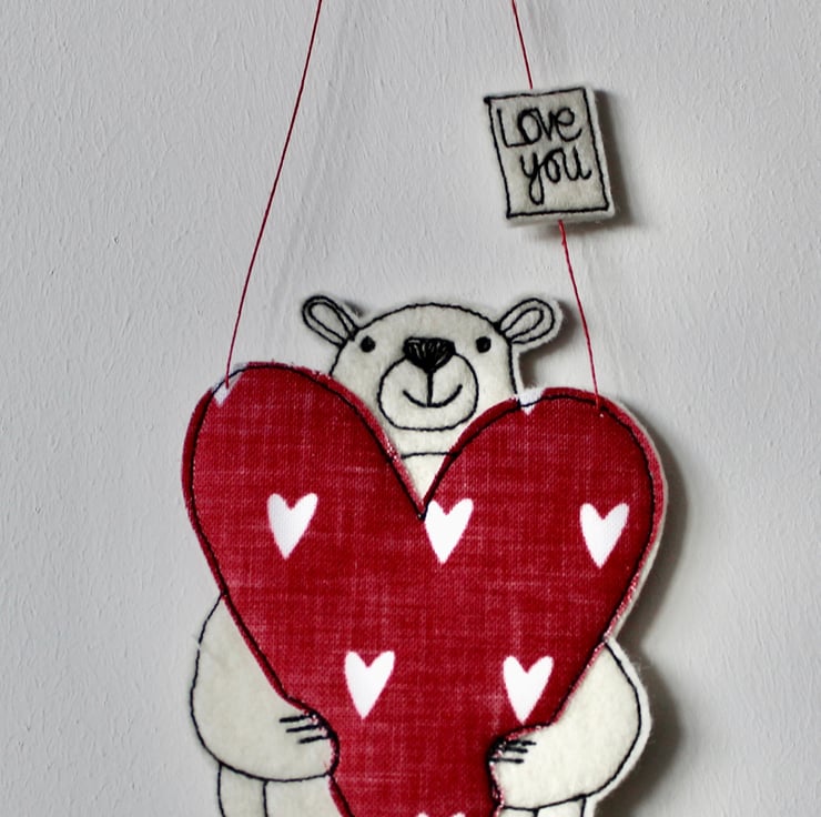 Mr Bear is created using free hand machine embroidery, 100% wool felt, cotton cloth printed with hearts and red linen string to hang. Multiple layers of cloth are sewn together and cut out by hand, using a very sharp pair of scissors.
