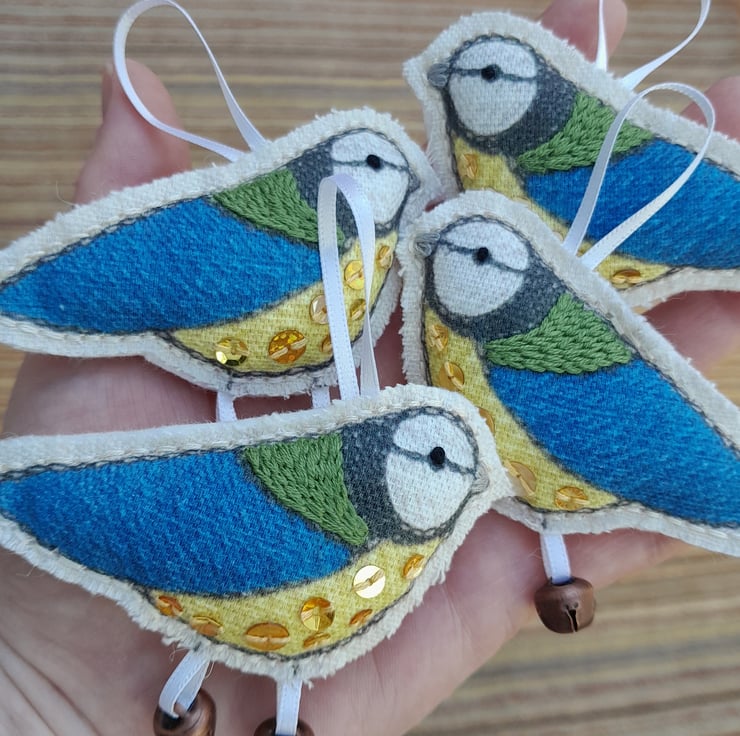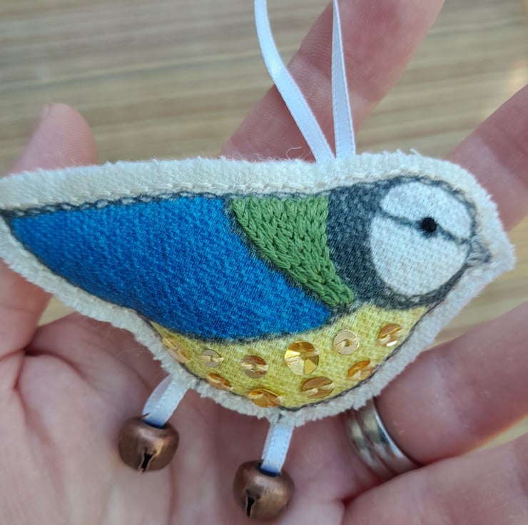 The basis of this little blue tit decoration is a digital reproduction of one of my original hand-stitched pieces.