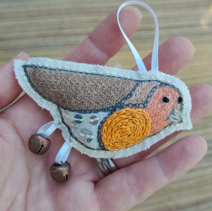 The basis of this little robin decoration is a digital reproduction of one of my original hand-stitched pieces.