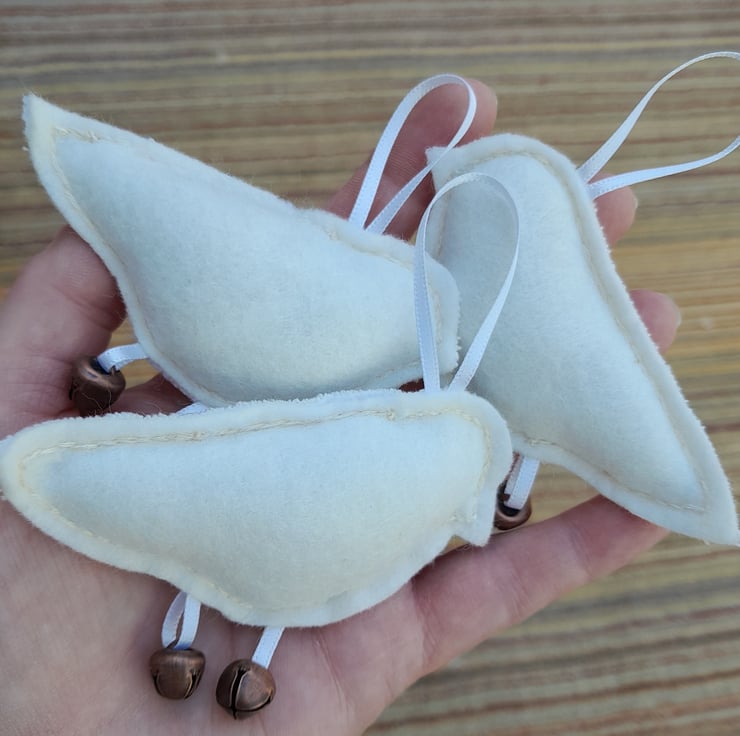 The reverse of the robin is a plain white wool mix felt. Front and reverse pieces have been hand-stitched together in a cream thread and lightly padded with a synthetic toy stuffing.