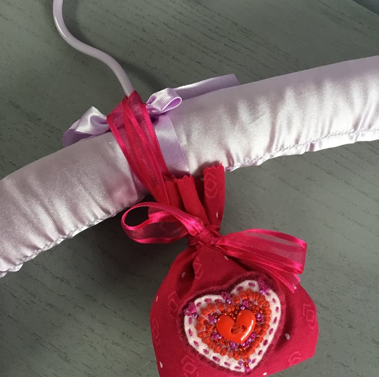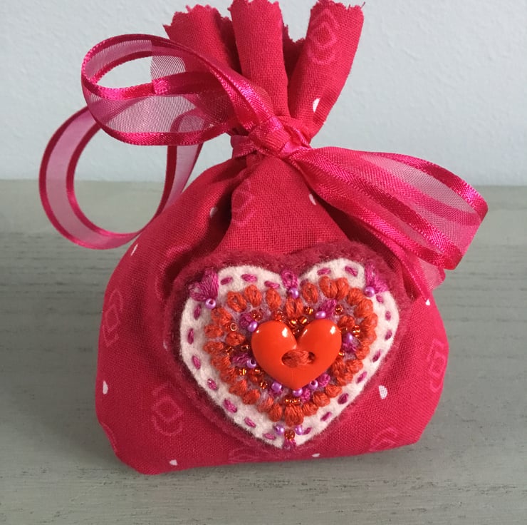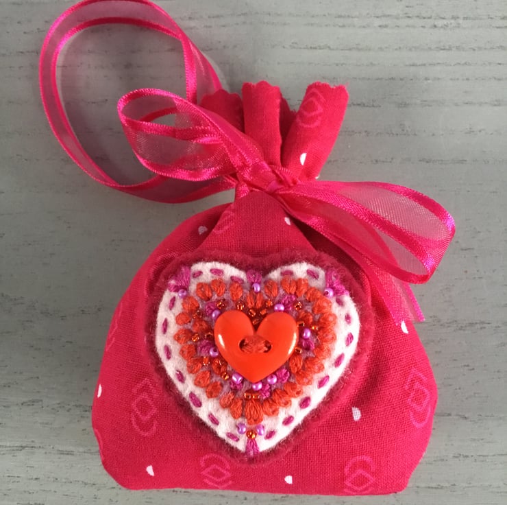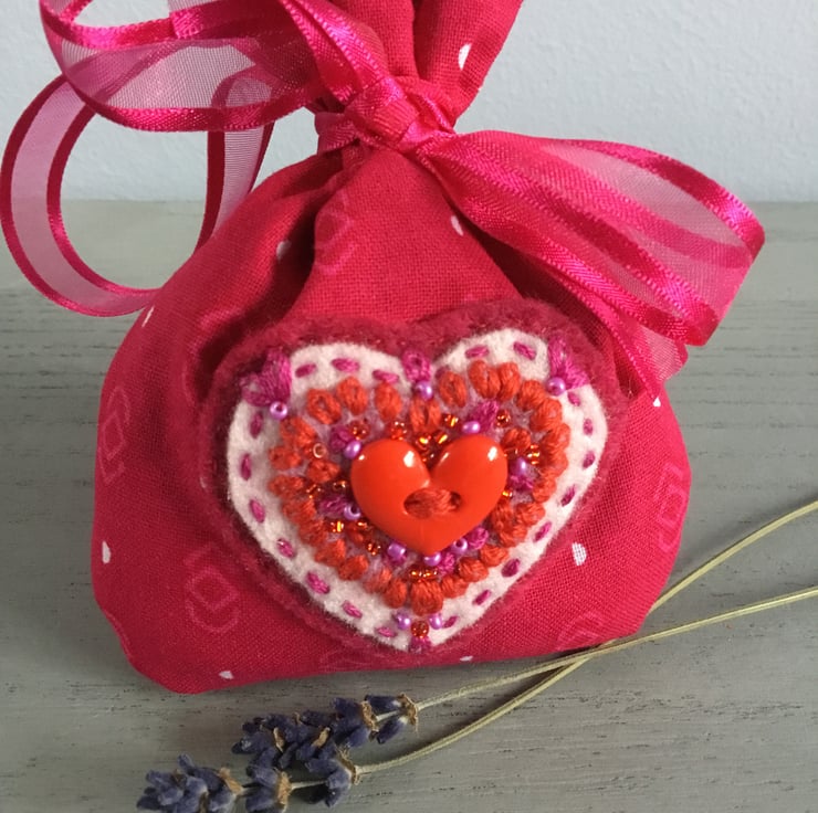 This cotton fabric lavender bag is in rich red and dark pink colours with a sumptuous heart shaped embroidery in pink felt at its centre with lazy daisy and running stitches, red and pink seed beads embroidered around a red heart shaped button.