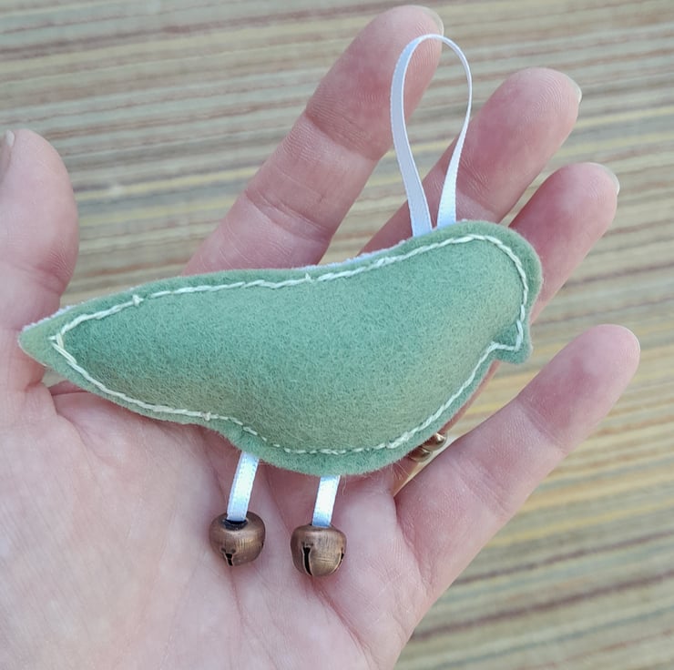 A white ribbon hanging loop is stitched between the linen and felt and tiny bronze red bells hang from its little ribbon legs.