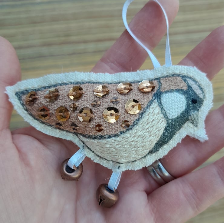 The basis of this little sparrow decoration is a digital reproduction of one of my original hand-stitched pieces.