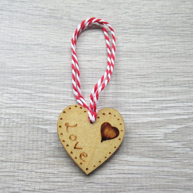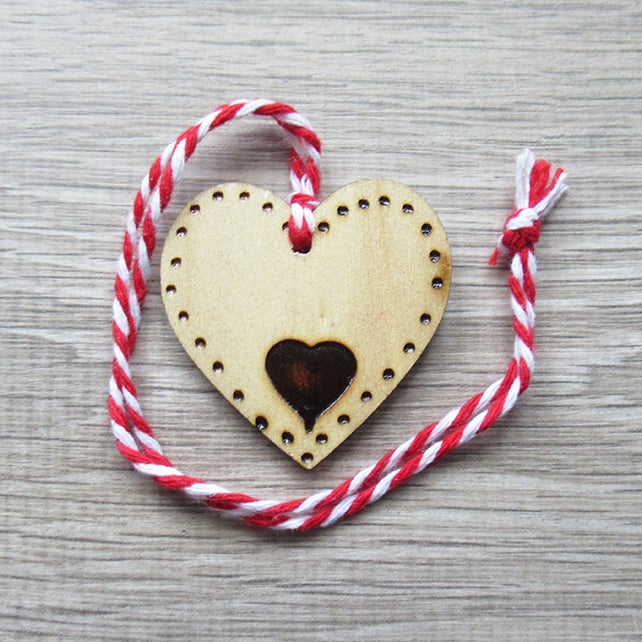 A mini wooden hanging heart. A decorative accessory with a love and heart design.