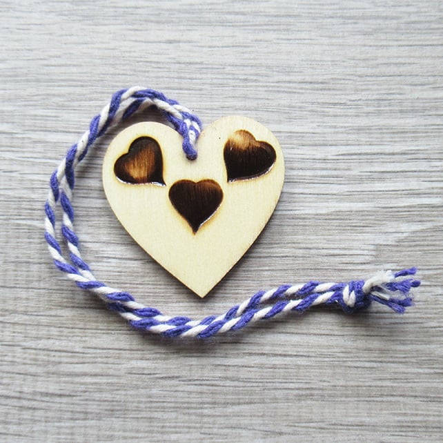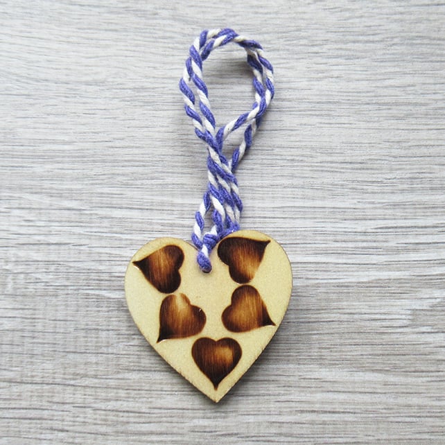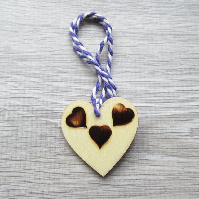 A mini wooden hanging heart. A decorative accessory with a heart design.