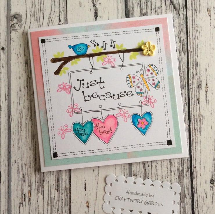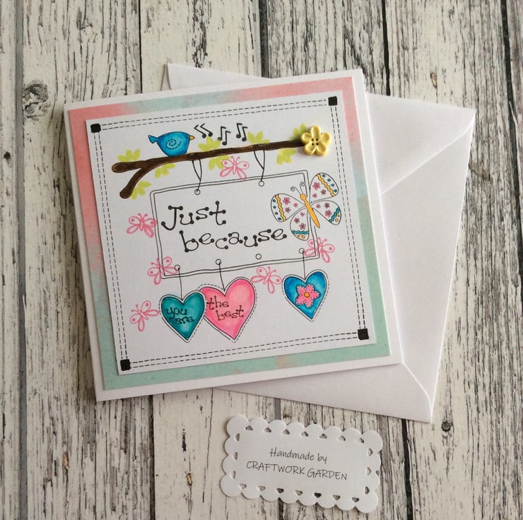 For the times when you want to send a card just because. This cheerful, pretty card has been hand stamped and coloured, complete with white insert left blank for your own message.