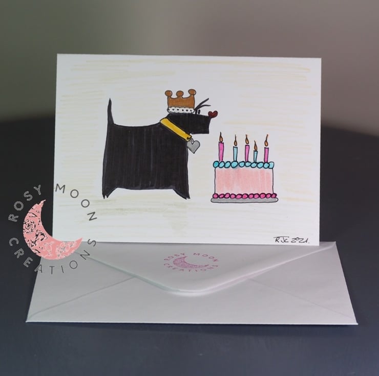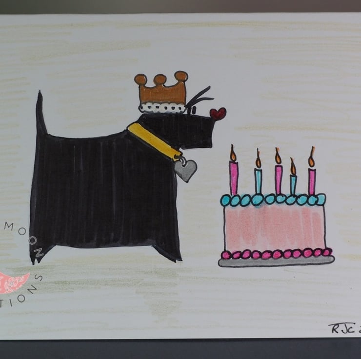 10x15cm hand drawn birthday card with a black Scottie Dog and birthday cake.