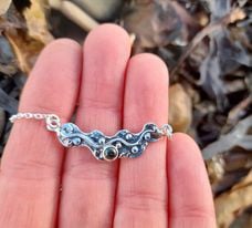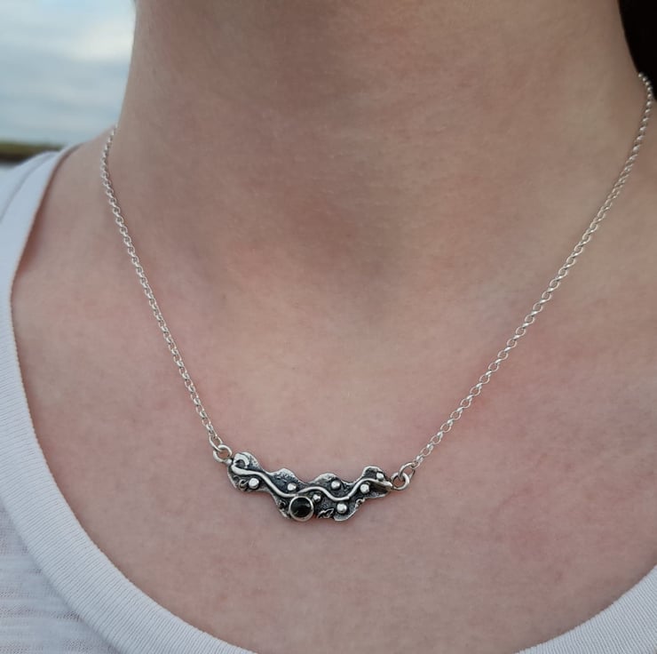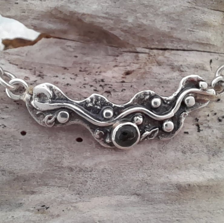 This stunning piece was inspired by strands of seaweed that the sea folds into beautiful swirls. Sterling Silver textured and oxidised with a 4 mm Dark Gren Tourmaline. The pendant measures roughly 40 mm in width. Standard lenght of chain and necklate is 16 inches but can be adjusted. Jewellery for mermaids.