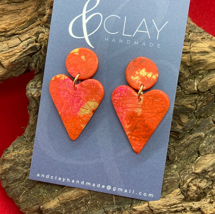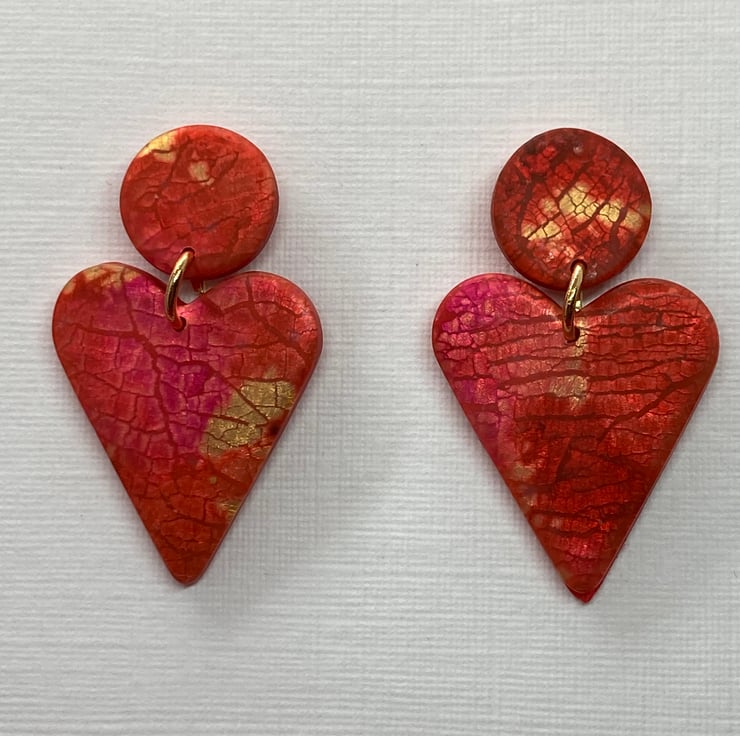 These pretty heart shaped earrings were made by adding imitation gold leaf to a clay sheet and then enhancing the surface with alcohol inks, creating patterns and effects that are simply beautiful! Gorgeous shades of red, pink, and gold give these earrings their rich surface pattern. Created from mixed media, they are unique, and one-of-a-kind. Using Premo Sculpey polymer clay, they are very light weight.