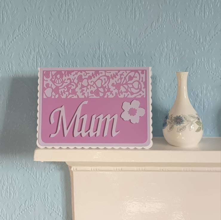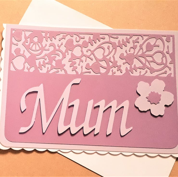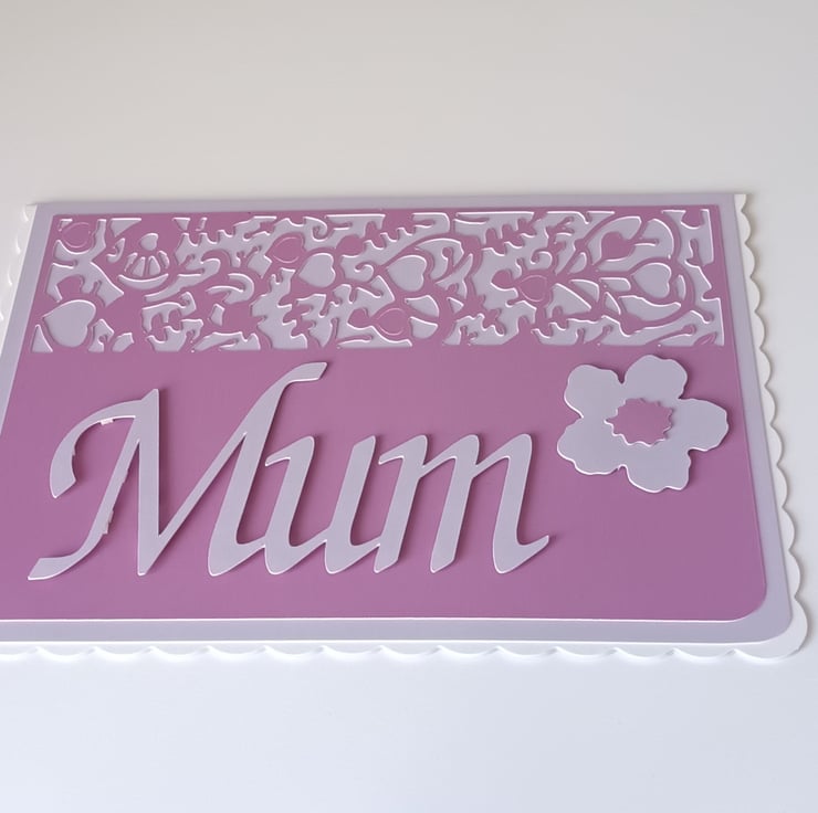 The card features a die cut top edge and raised die cut “Mum” and flower.