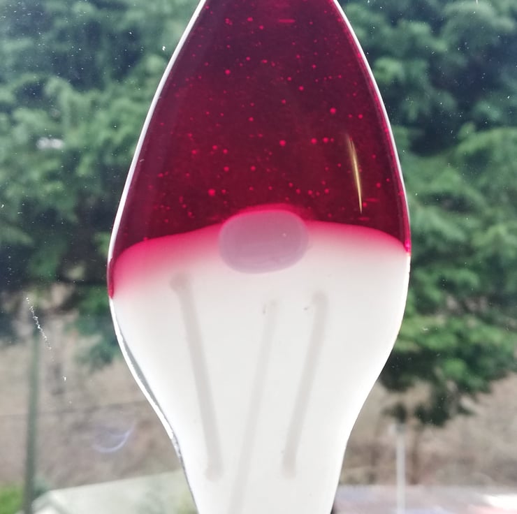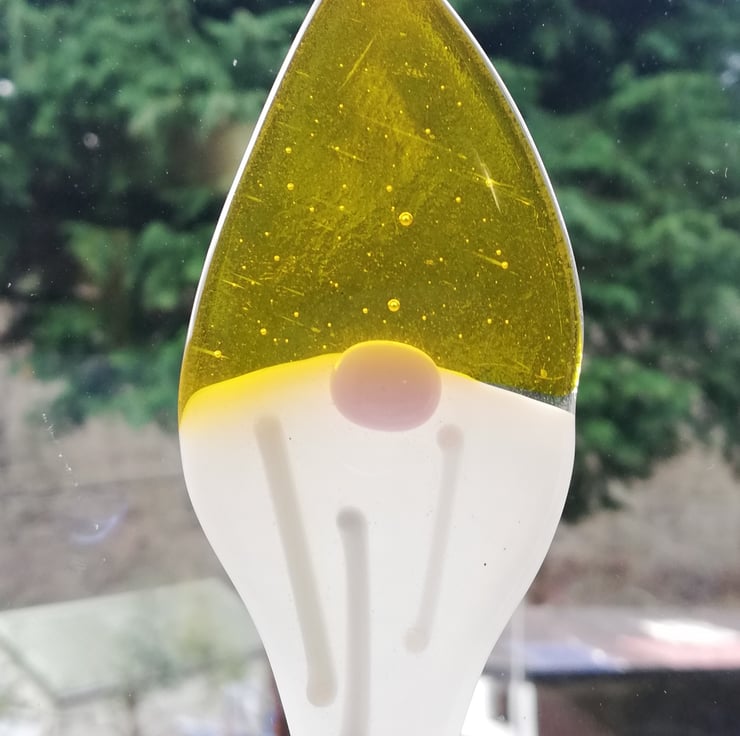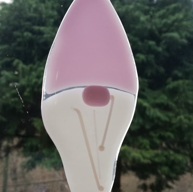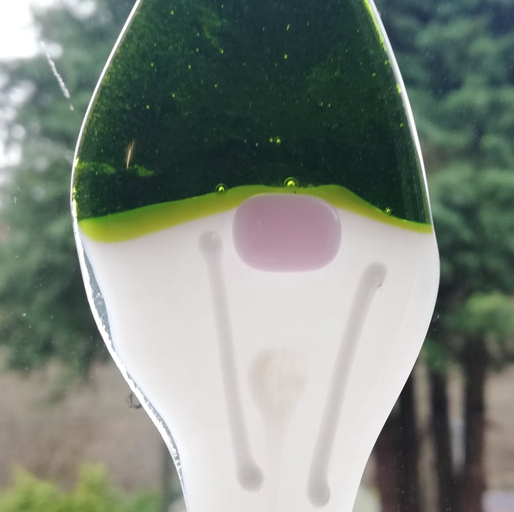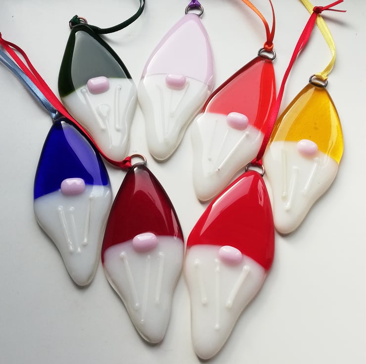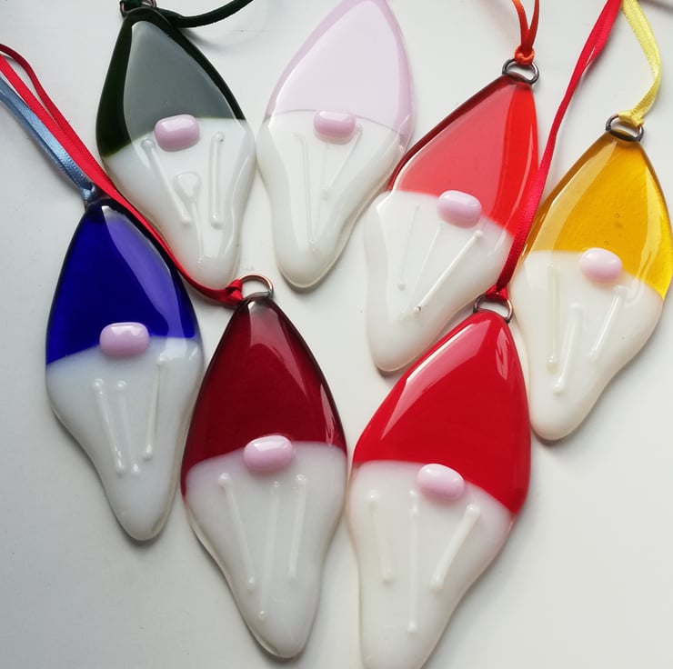 Each cute gnome is individually hand cut, from fusing glass, and placed in the kiln to fuse. Once fused, the details of the beard and nose are added. Each little nose has been pre-fused to shape before adding, and the beard strands are made from glass that has been shaped and manipulated in the flamework torch. The piece is then put through another kiln cycle to fuse the details to the base. Finally, when fused together the gnomes are cleaned, the copper hanging rings polished and a piece of ribbon attached to allow it to hang.