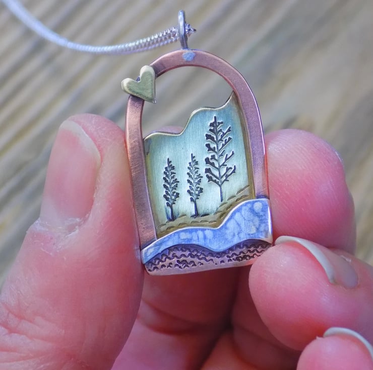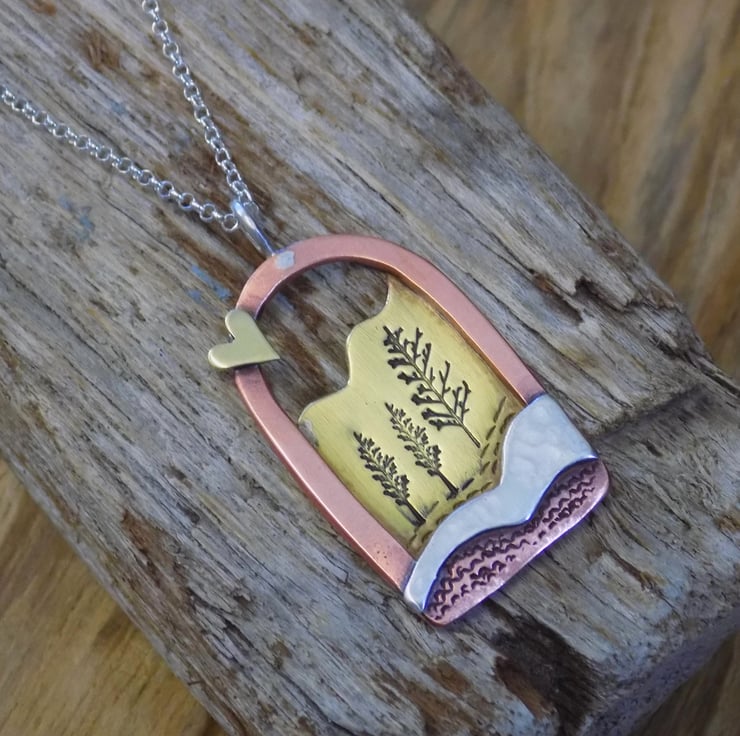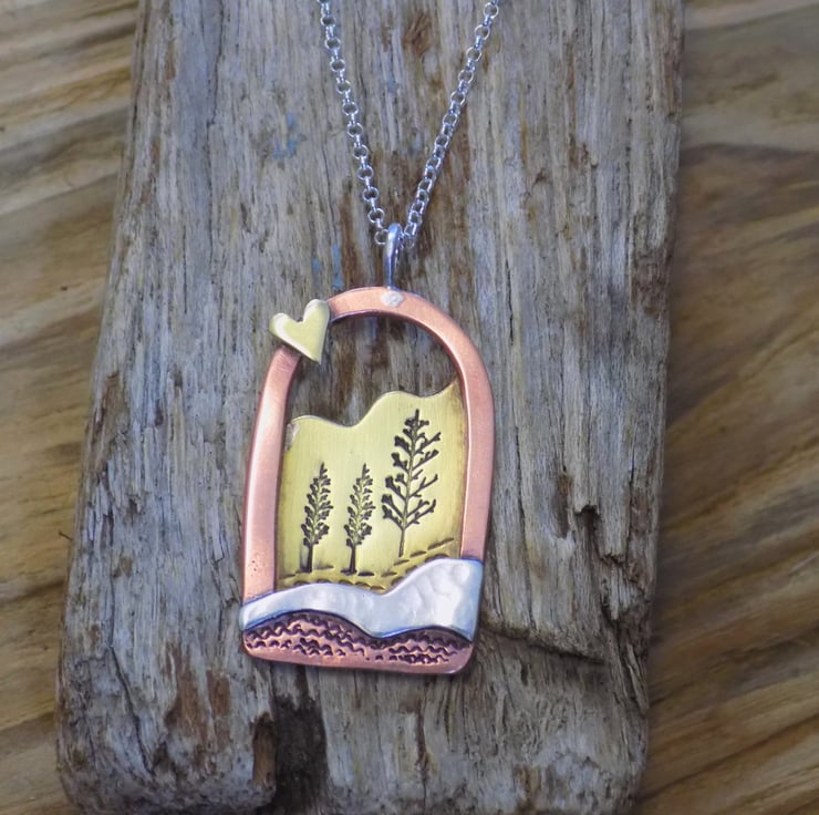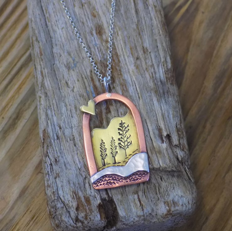 Made from brass, copper and sterling silver sheet. Two layers of metal have been carefully put together and soldered on to a thick copper frame which captures a pretty scene. The silver layer at the front is hammered for texture, and the brass layer at the back has pretty trees stamped within and some landscape texture to. To make it extra special a tiny brass love heart has been soldered on to the frame. Suspended from a sterling silver 18" belcher chain.