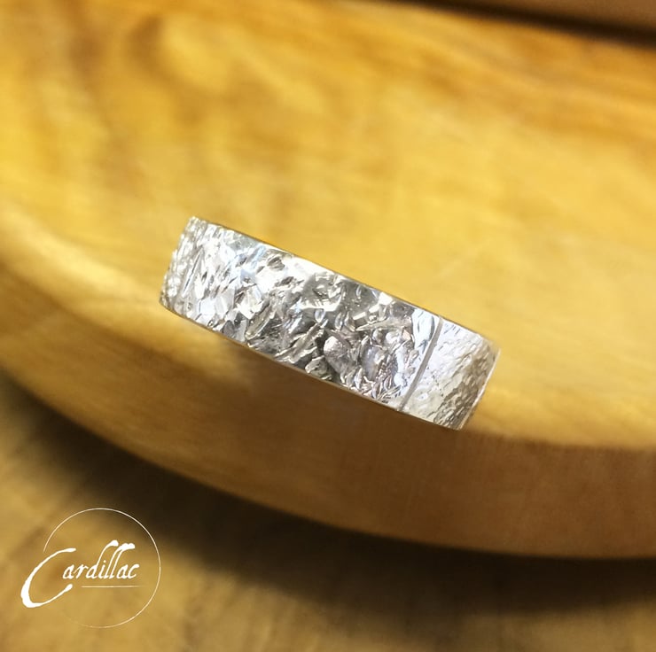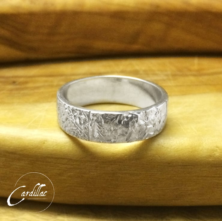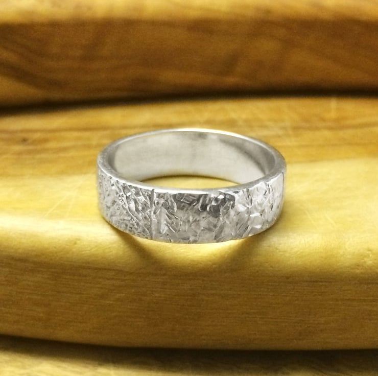 Handmade Sterling Silver 6mm wide,1.5mm thick band ring. It contains my personal Sheffield Hallmark. The 4- fold textures are hand chased/engraved, changing as the band is rotated.
