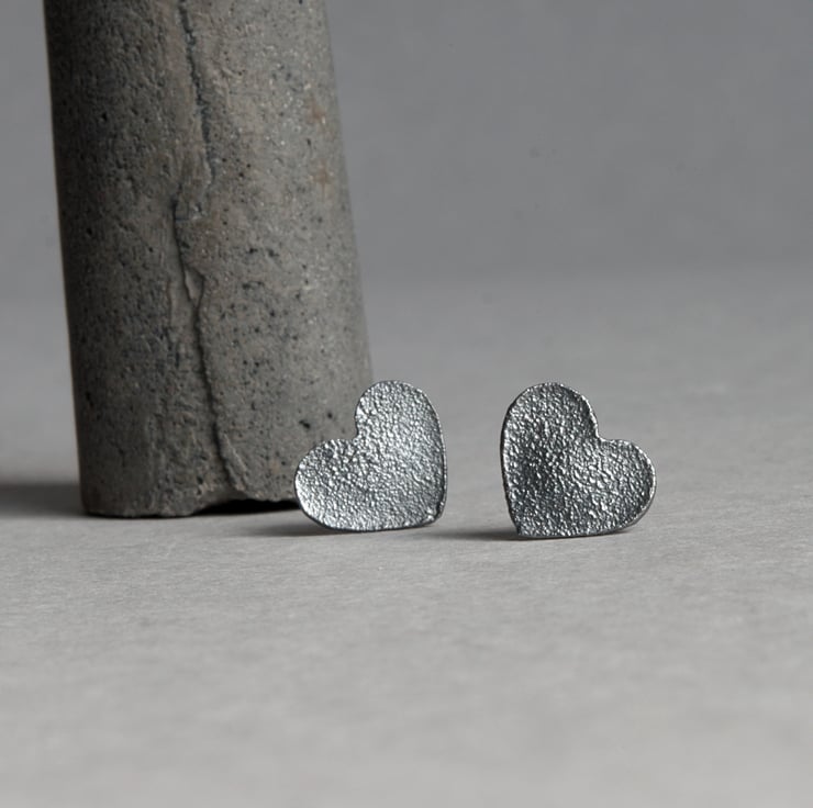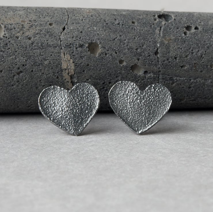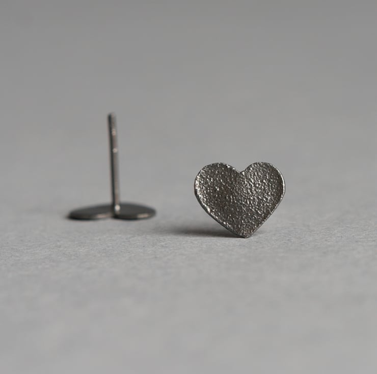 Simple black stud earrings made with oxidized sterling silver hand cutted hearts.
