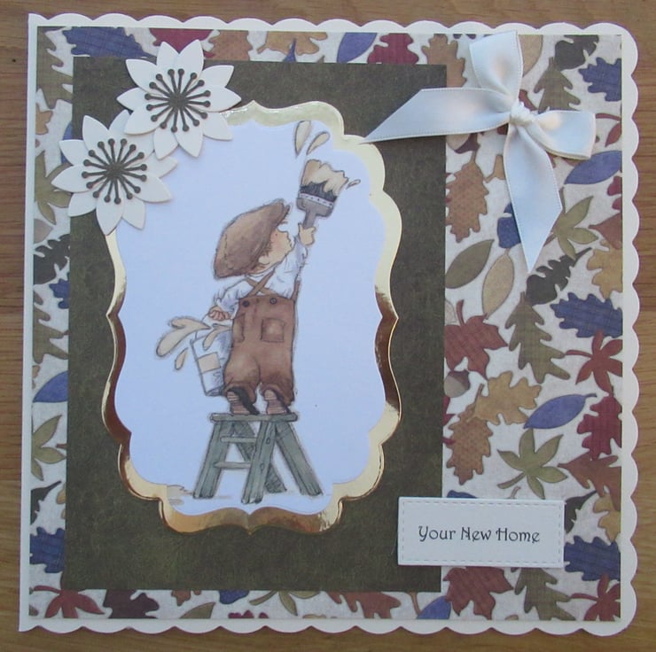 It features a young boy in a flat cap stood on a step ladder painting the wall. The image has been die cut with a decorative rectangular die with a gold mat behind it and embellished with 2 home made die cut flowers and a cream satin ribbon. The background has layers of dark green and brown in a leafy pattern to match the topper and the inside coordinates but has been left blank for your own message.