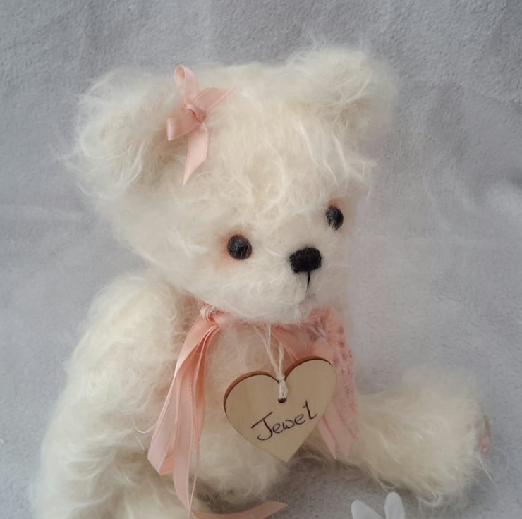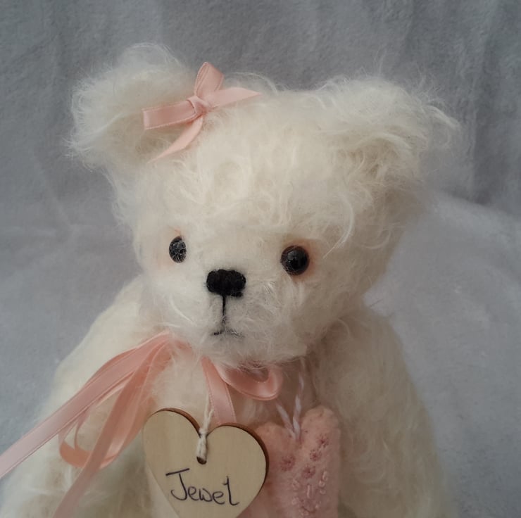 Jewel is approx 10.5" tall and hand crafted from luxury 20mm Helmbold ratinee mohair in snowstorm. A beautiful off white curly mohair.