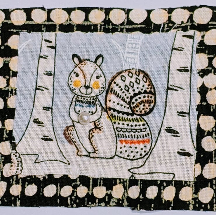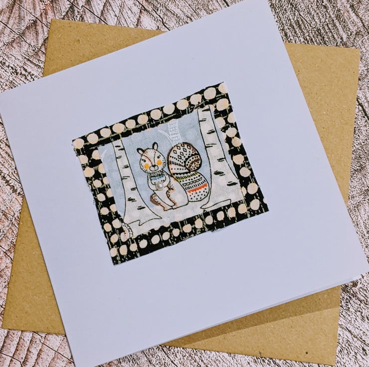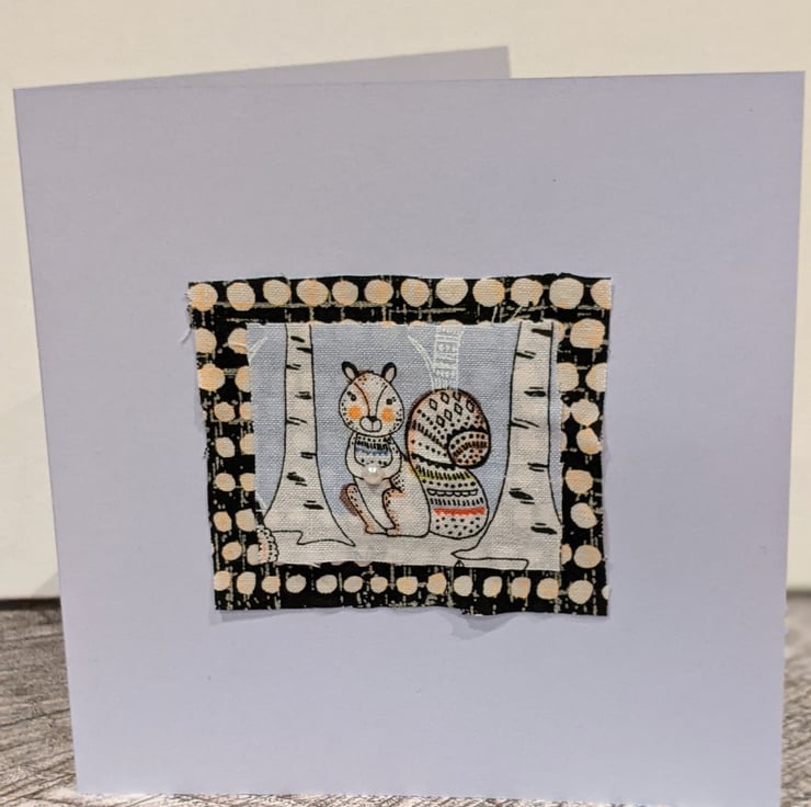 A sweet card of a squirrel. Using an eco friendly pale lilac card. Fabric and a pearl embellishment.