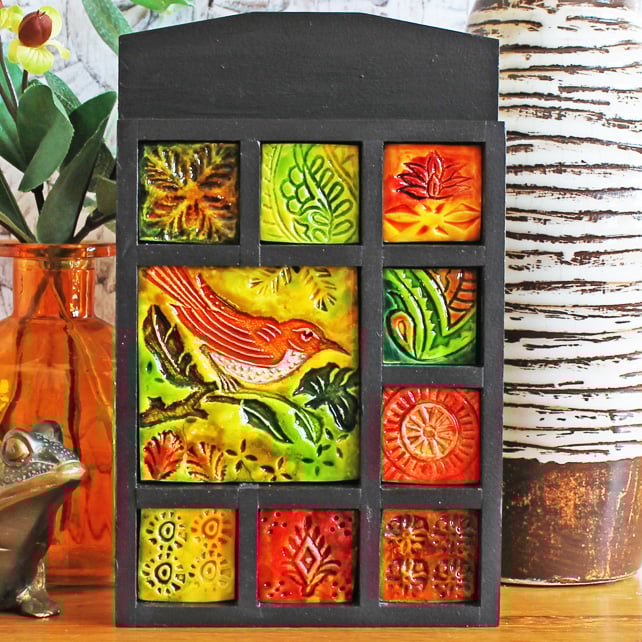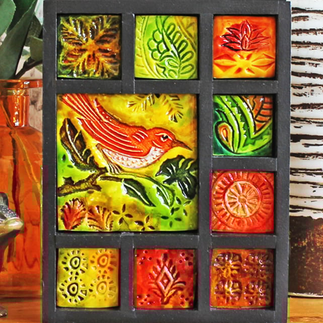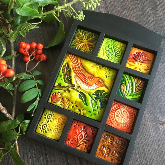 The artwork is housed in a vintage wooden thimble rack which has been given a coat of black acrylic paint. Polymer clay tiles have been made to fit each compartment and debossed with a range of patterns and designs. I've used layers of glass paint in rich Autumnal hues to add colour and lustre.