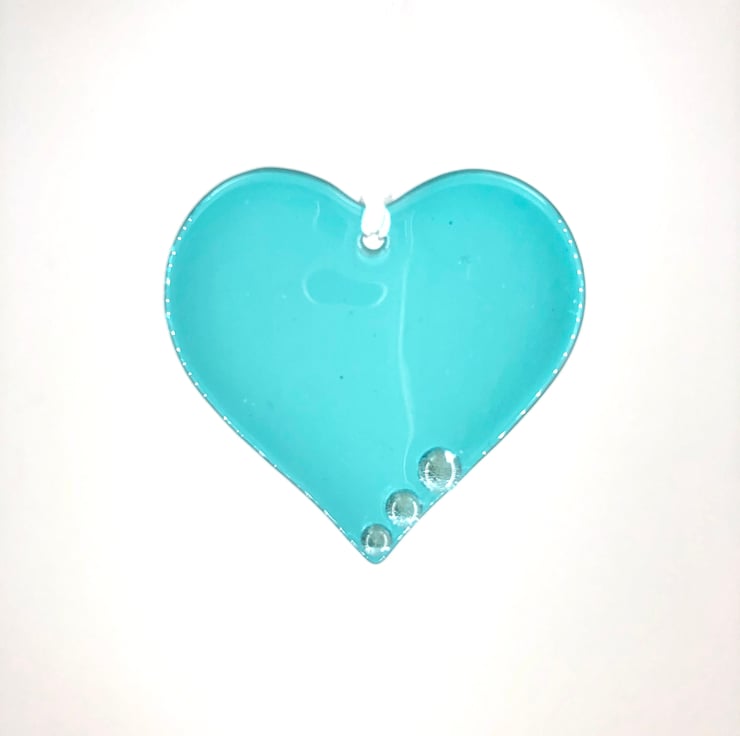 This gorgeous heart is made from a turquoise glass called Caribbean Blue & it certainly lives up to its name! It has three sparkly dichroic glass beads fused on, because we all love a bit of bling!