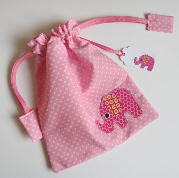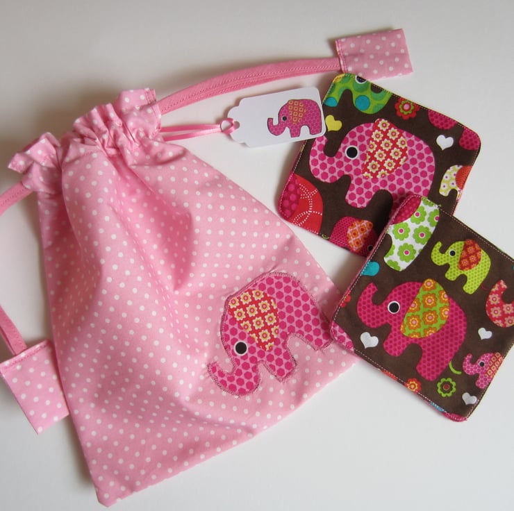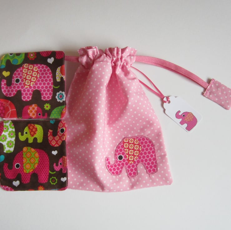 It comes complete with a matching appliqued elephant pink and white spotty drawstring bag that can be used in 3 ways; as a storage bag, to use in the washing machine when washing the pads and as a gift bag if giving as a present. It measures 22 x 18.5 cm.