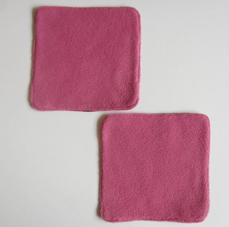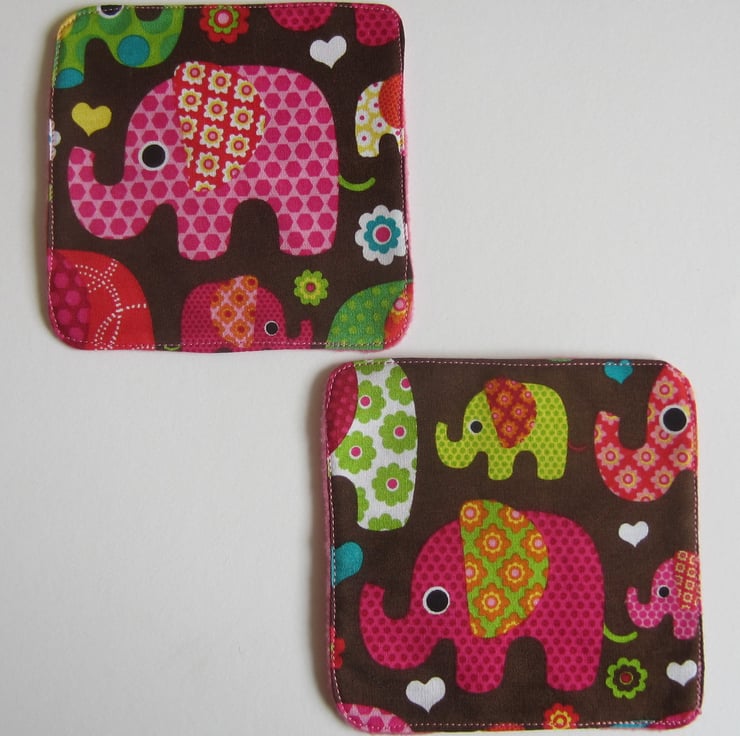 2 reusable make up remover pads made from a funky elephant fabric and backed with a pink soft fleece fabric. Each pad measures 10 x 10 cm.