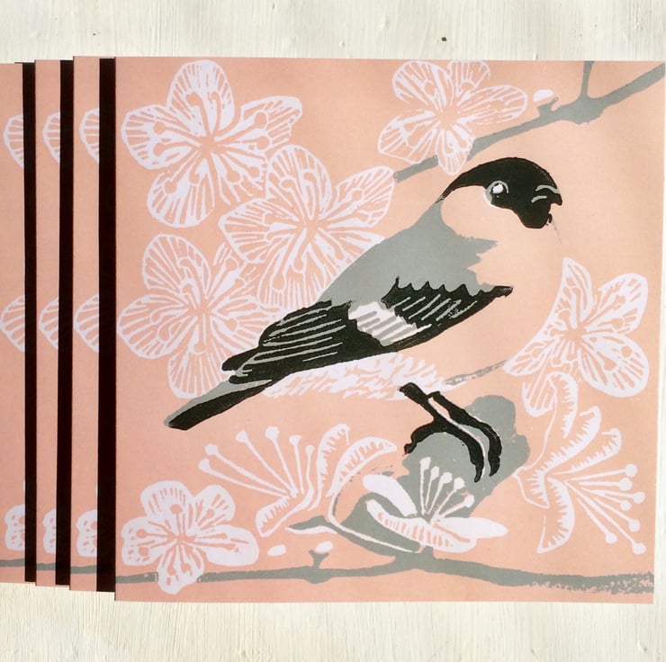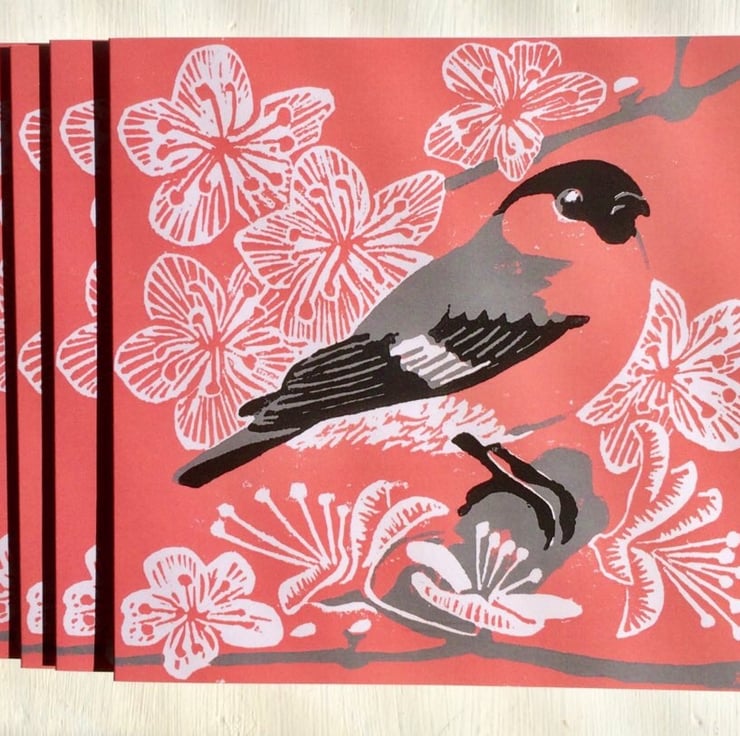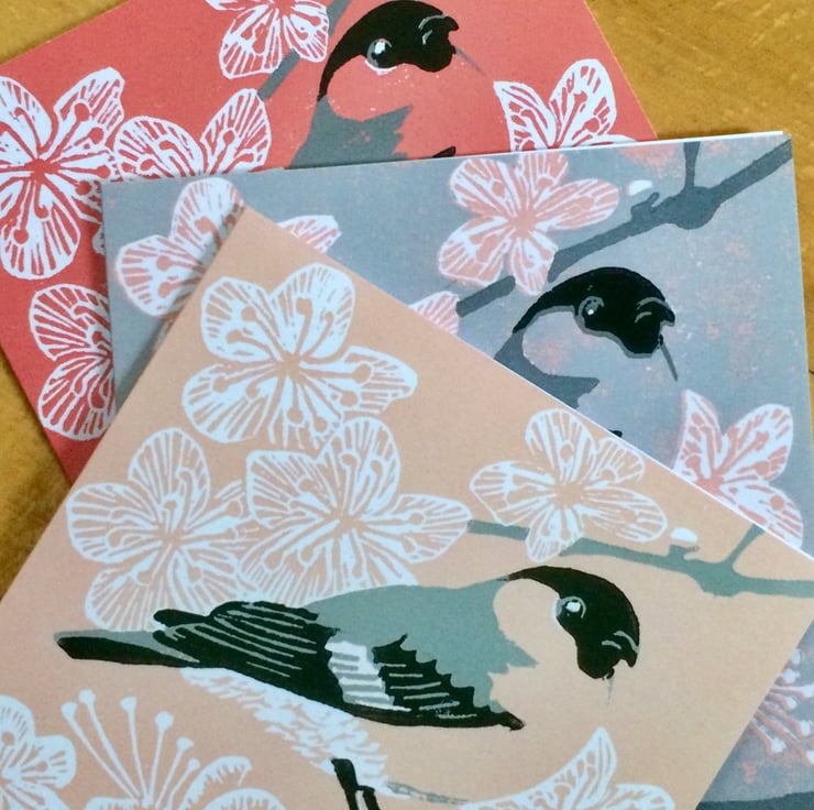 Pack of three square cards with white envelopes featuring my linocut design of a bullfinch in a blossom tree. Perfect for Springtime birthdays, thank yous, Mother's Day - or just lockdown hello!
