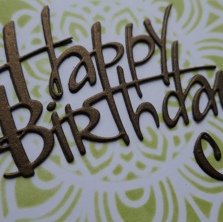 A Zen Mandala has been stencilled onto white card with green pearlescent ink. The corners have been rounded on the panel and it has been attached to the centre of the card. 'Happy Birthday' has been die cut twice from brown pearlescent card, these have been layered and attached across the centre of the mandala.