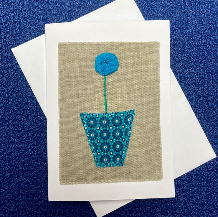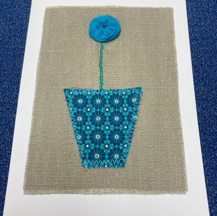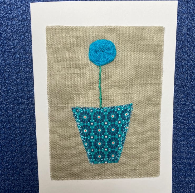 The flower is hand embroidered and the pot has been machine sewn onto natural linen and mounted onto a white greetings card. The card is 6" x 4" (10.5cm x 15 cm) and comes with a matching envelope. The card has been left blank inside for your own message.