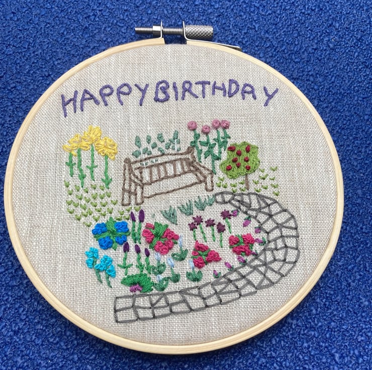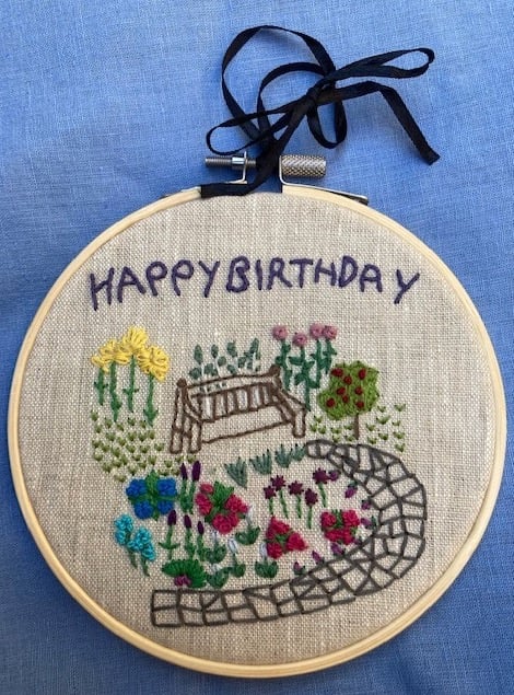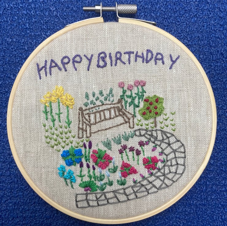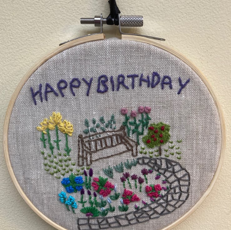 A charming cottage garden with a birthday message. This cottage garden vignette with a bench and pretty selection of flowers has been hand embroidered onto natural linen. The embroidered scene comes in a 5" bamboo embroidery hoop. The hoop is backed with cream felt and has a piece of blue ribbon should you wish to hang it on the wall. It will be wrapped in tissue paper and mailed in a cardboard mailing box.