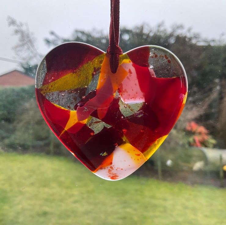 Beautiful glass heart with a range of reds, pinks and oranges. These hangings look stunning in a window with the sunlight passing through and each one is completely unique.