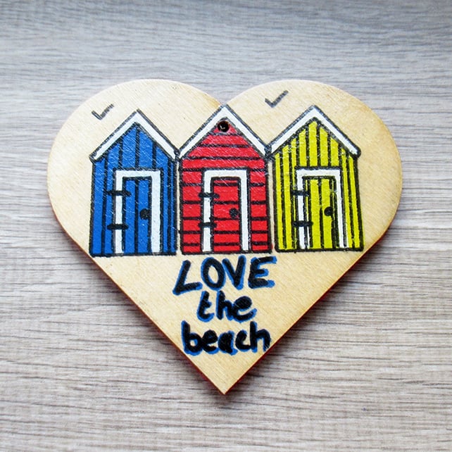 Hanging heart decoration. Wooden heart, featuring a beach hut design and the text