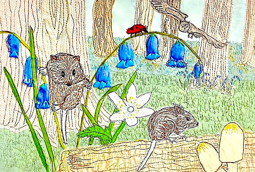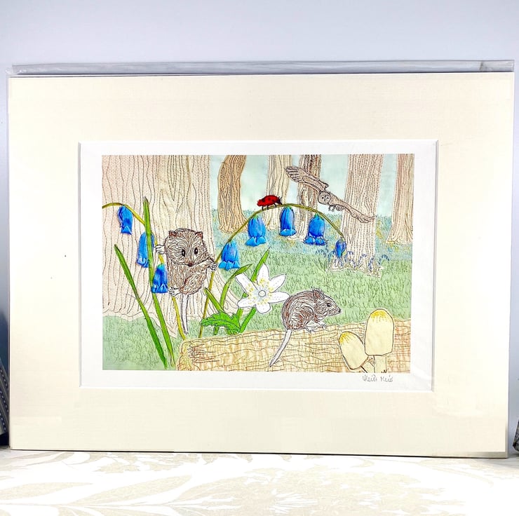 The original textile artwork, from which this print is reproduced is called Woodland Mouse and is an original design by textile artist Heidi Meier. Giclee printing is used which gives a very high quality reproduction of the original, which featured an adorable woodland mouse perched between two bluebell stalks. whilst next to him his friend is sitting on top of the fallen branch. In the far distance, an owl is swooping down, but has our little mouse been spotted?