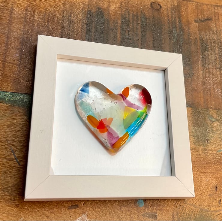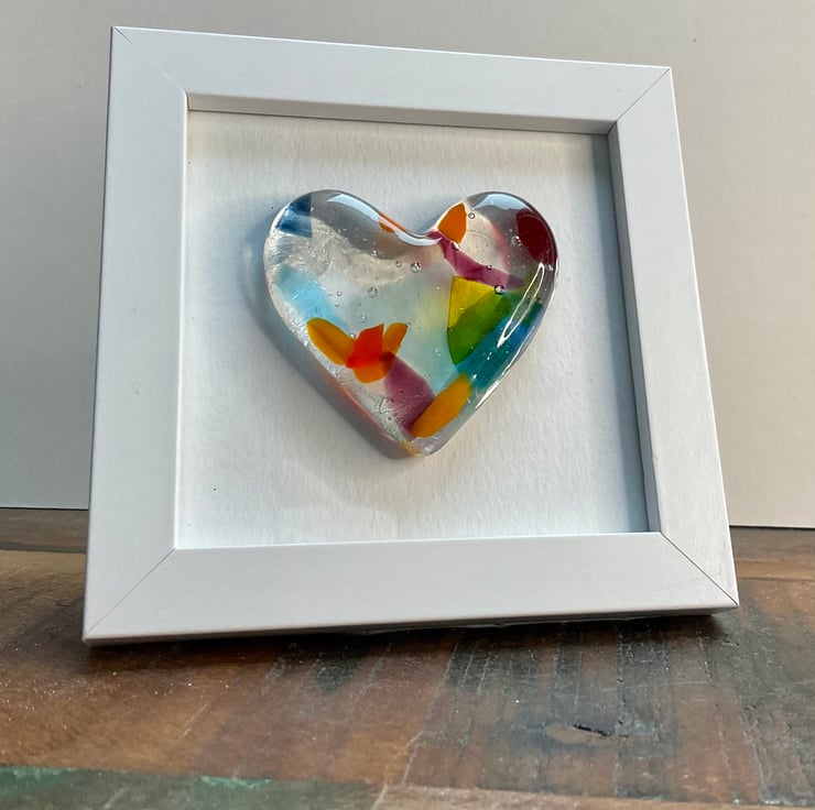 Handmade fused glass heart completely unique and displayed beautifully in a simple white frame. This makes the ideal gift for a loved one.