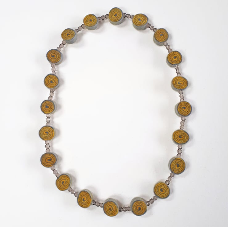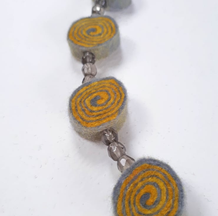 I make the felt beads in colour combinations that I like and then combine them with other beads to complete the necklace. The colours in the felt beads spiral round each other. Here I have used transparent faceted grey glass beads to go with the felt beads. The sheen of the glass beads complements the matt nature of the felt. The necklace is strung on elastic cord.