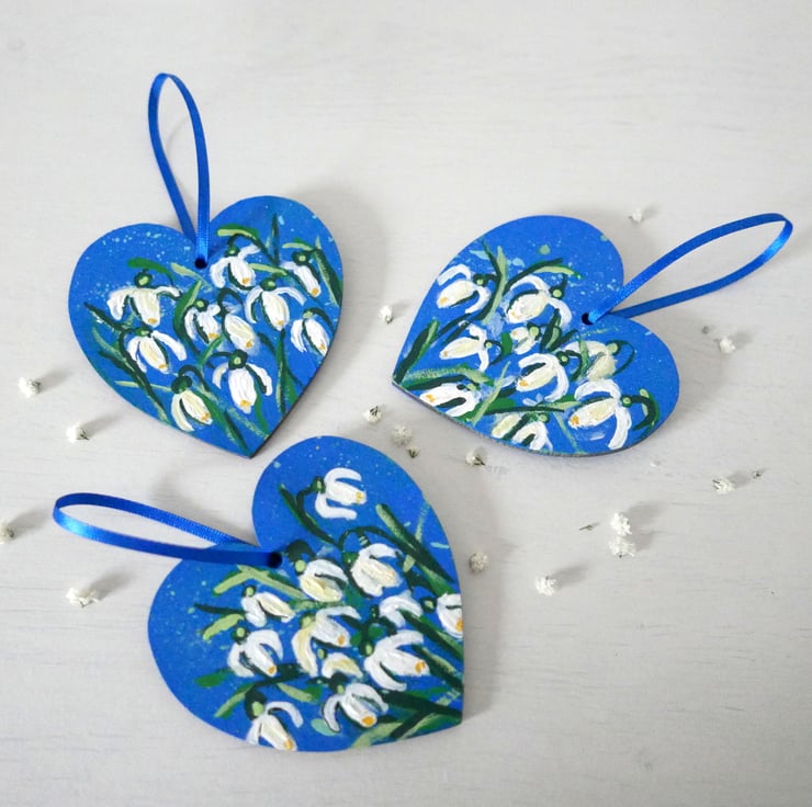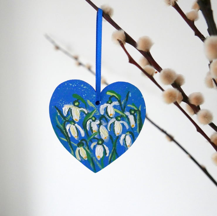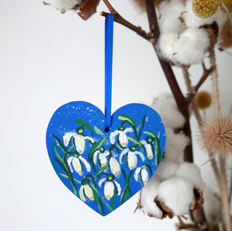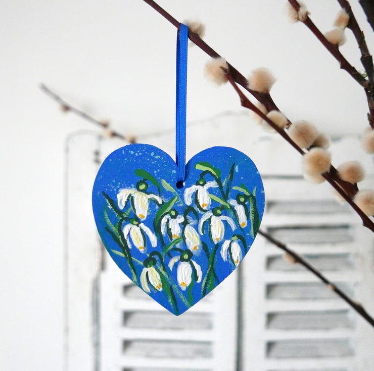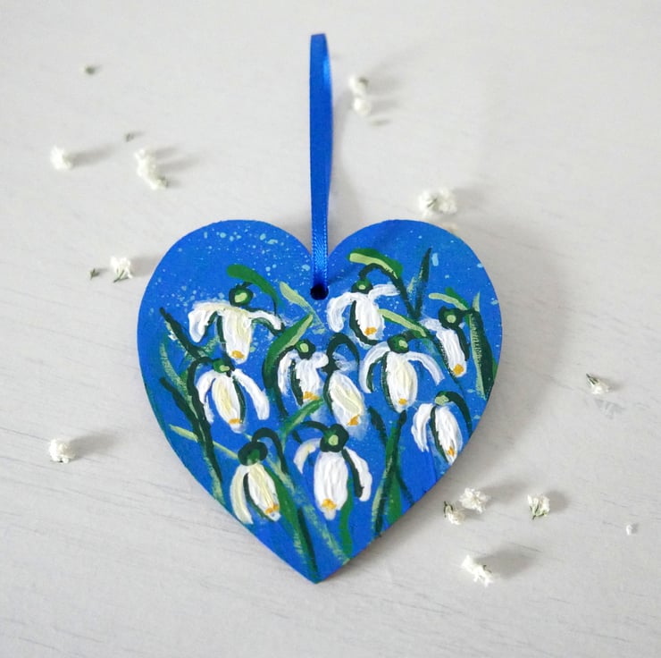 This listing is for one hanging heart featuring a bouquet of snowdrops against a blue background. The blue heart is painted at the back in plain blue to match the front and it finished with a ribbon in the same colour. The heart measures 3" x 3" (7.5cm x 7.5cm) and it is varnished for protection.