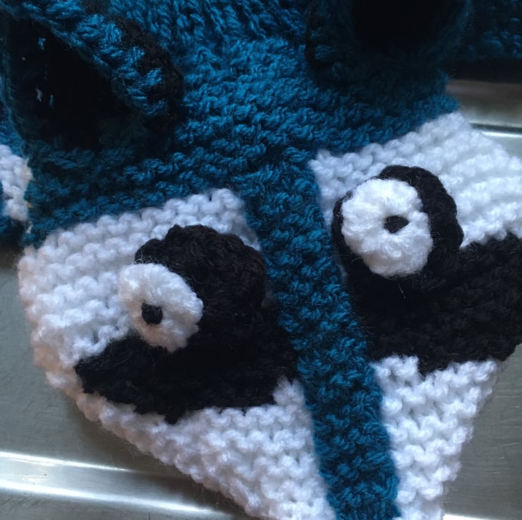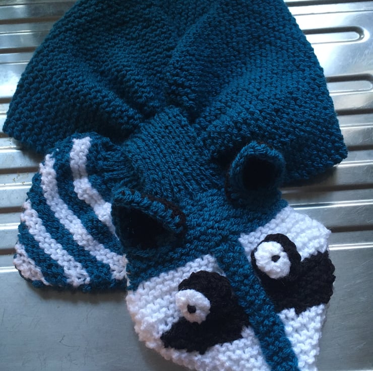 What child does not like a little cuddly animal and this cheeky raccoon scarf is both cosy and fun. Hand knitted in petrol blue double knitting the scarf measures 21 1/2 inches from cross over sections and fastens by threading the tail through the loop at the top of the head. With big eyes and stand up ears, this little crittur will be a sure hit with little ones.