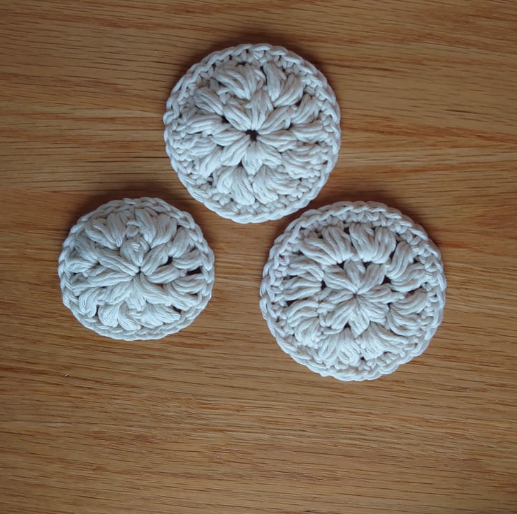Set of 3 face scrubbies, crocheted using 100% cotton yarn; slightly different sizes, eco-friendly and reusable, makes the perfect little gift or treat yourself. Personally I love them and now I never buy cotton pads for cleansing or toning..