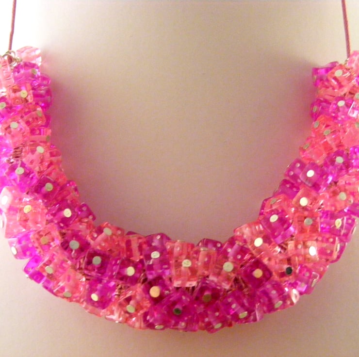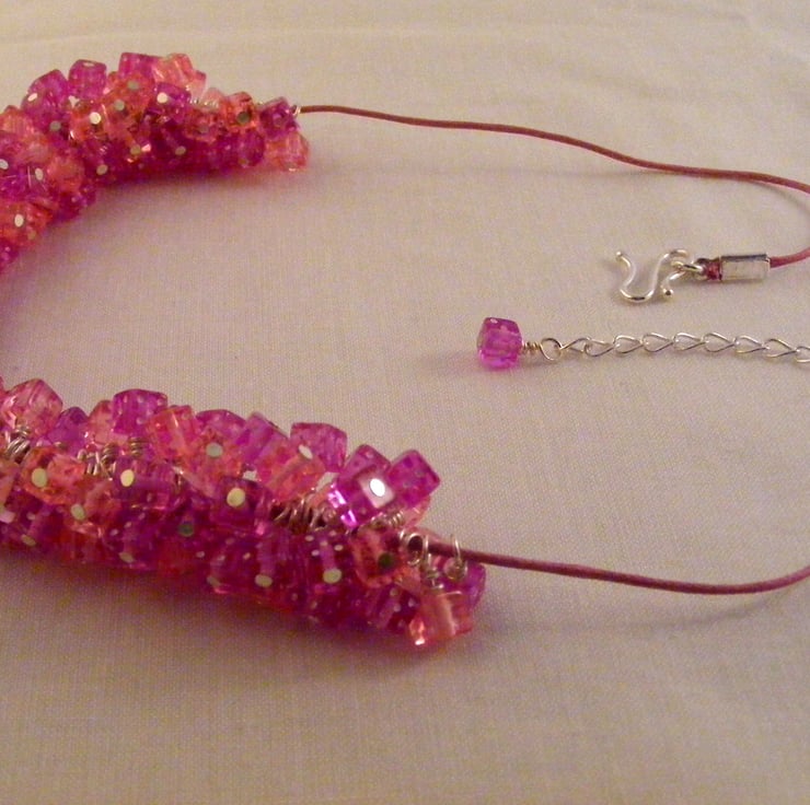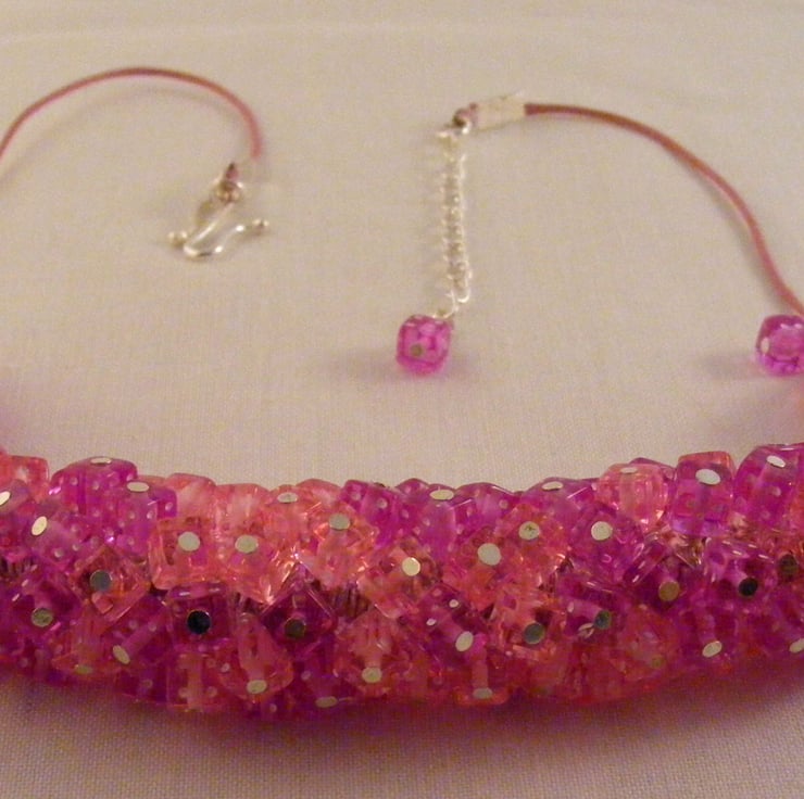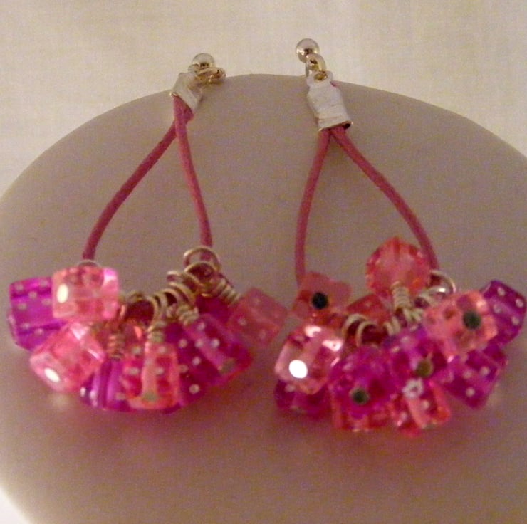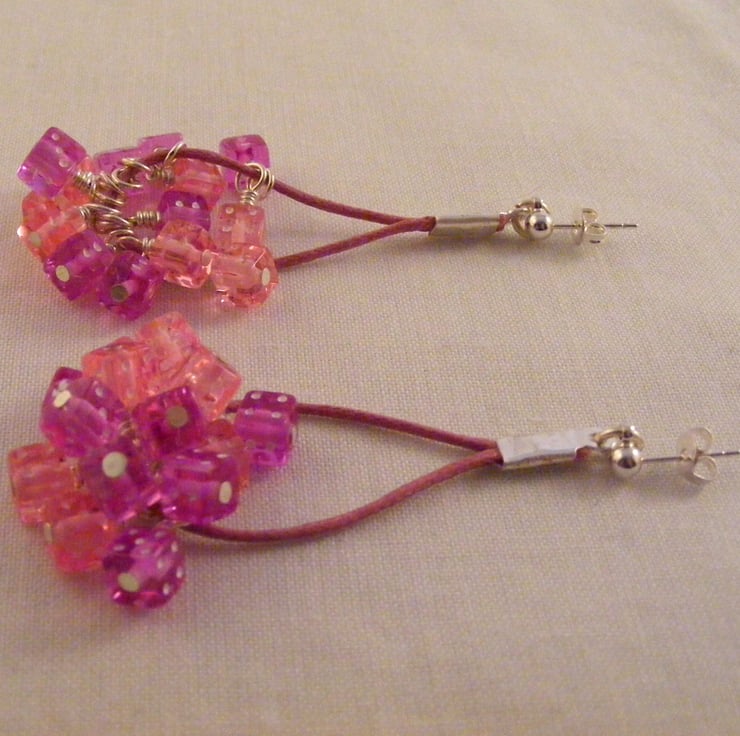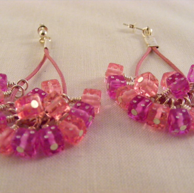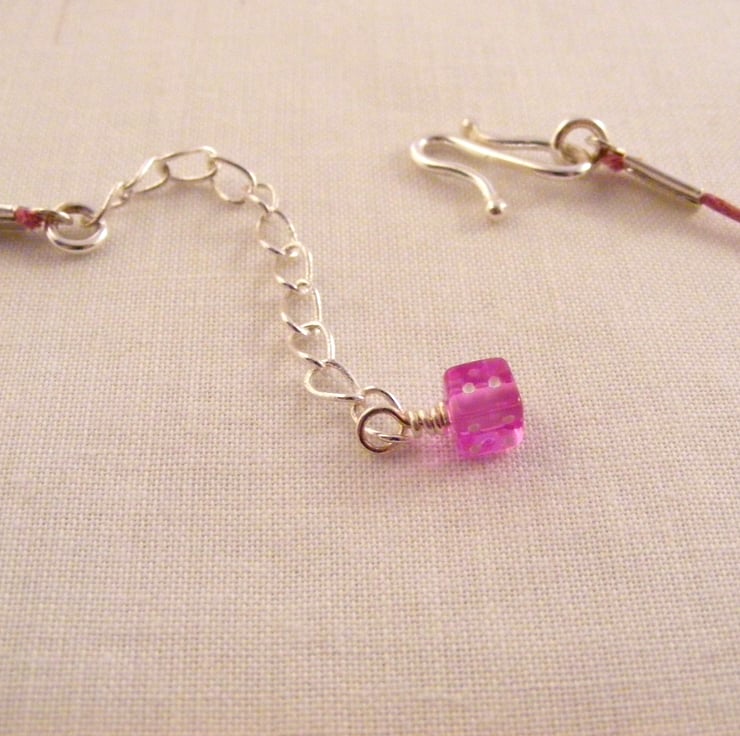 I've handmade this fun, novelty jewellery set which consists of a necklace with matching earrings using, 6 mm pink and purple acrylic dice beads, silver plated findings and pink cord. Necklace has a S clasp and extension chain. Earrings have silver plated studs.
