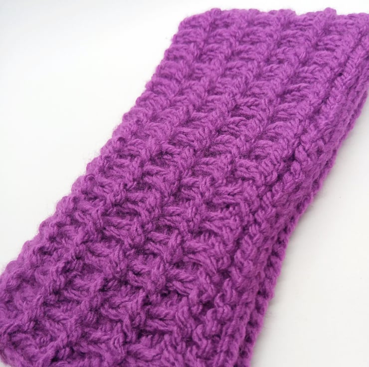 Girl's purple head band hand knitted in purple aran yarn. It would make an ideal gift for a a girl's birthday. It can also be a gift for your own daughter. It is made to fit an average sized head for the given age groups.